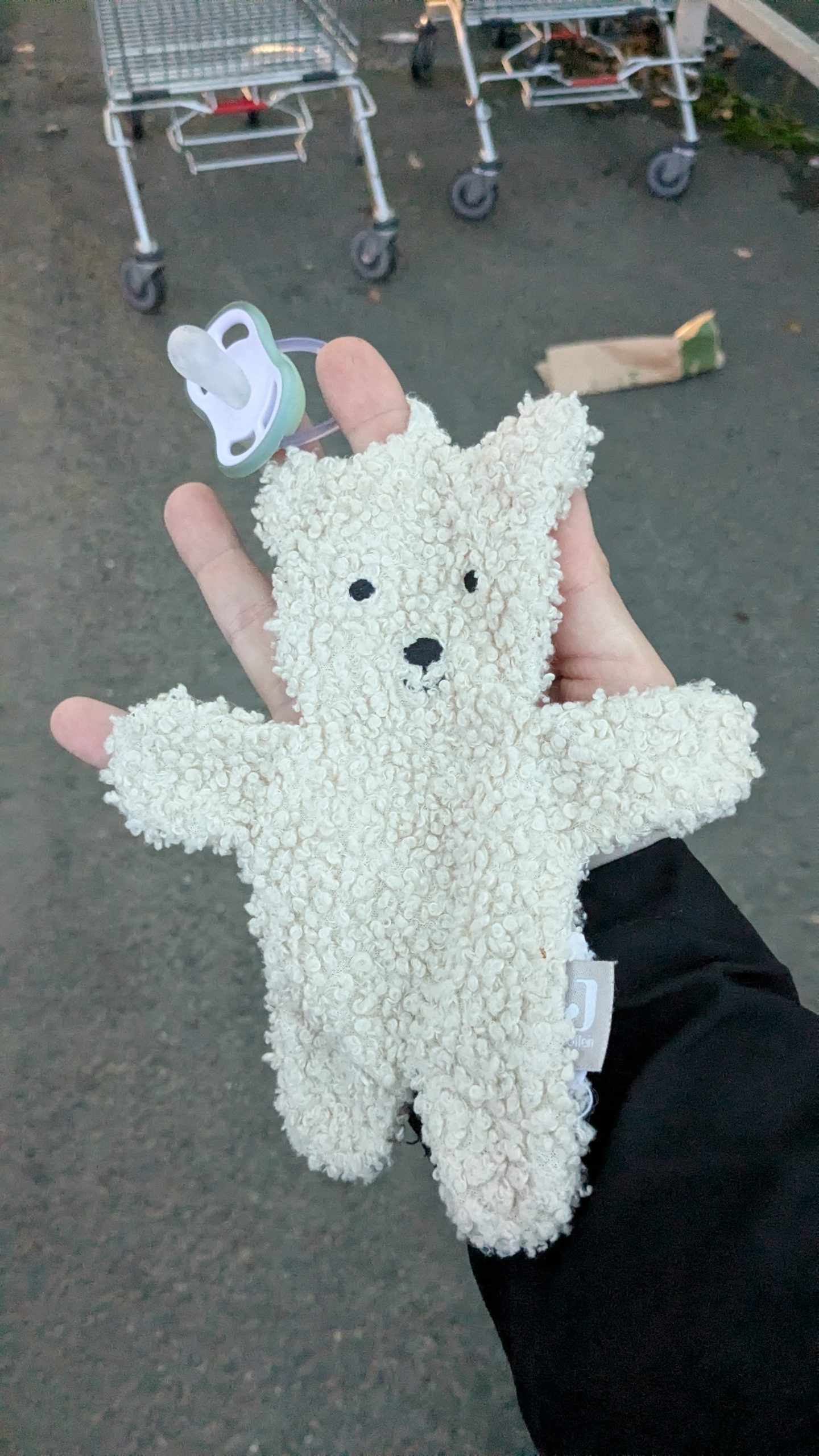 Objet trouvé : Doudou ourson plat couleur crème et tétine