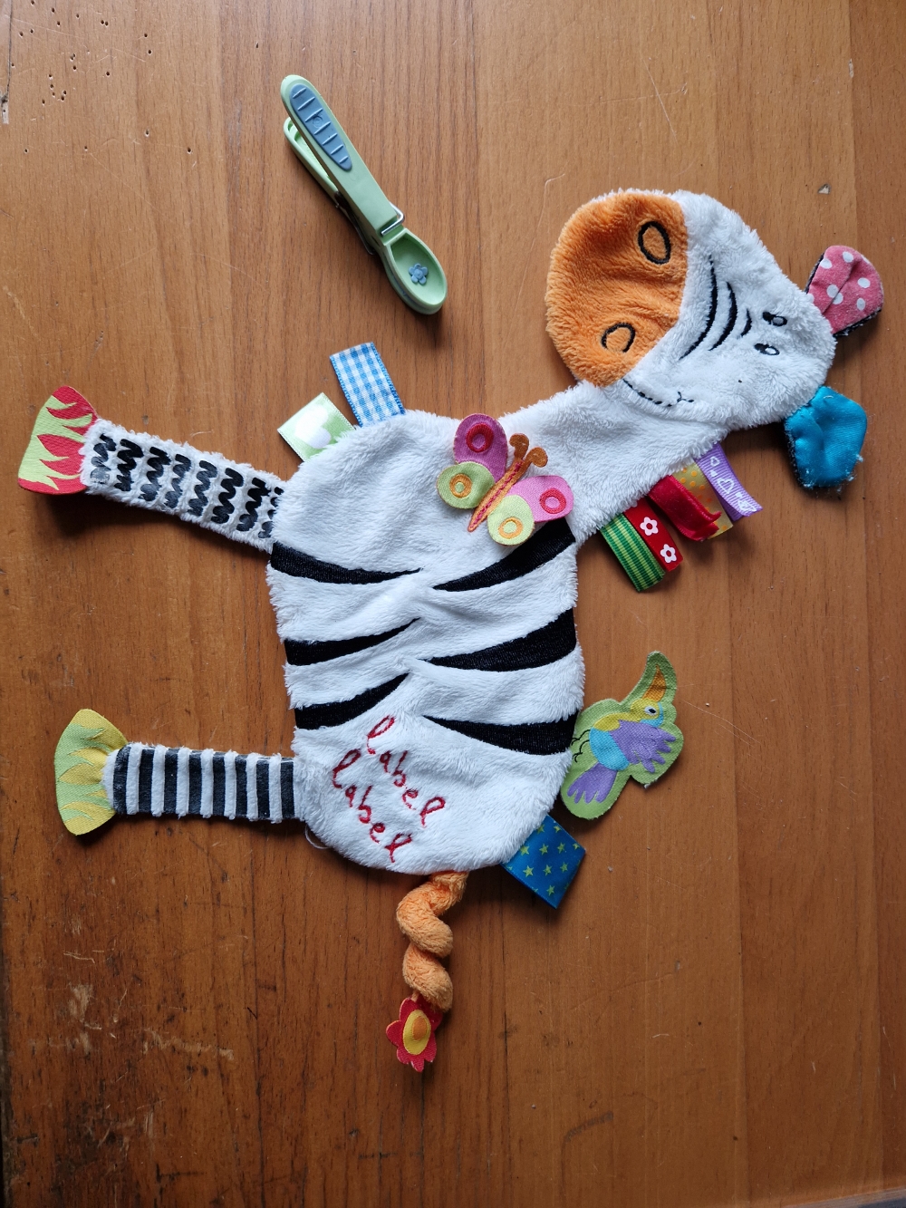 Un zèbre à museau orange, oreilles en patchwork, un oiseau sur le dos, une fleur à la bouche et une queue orange matière pilou pilou