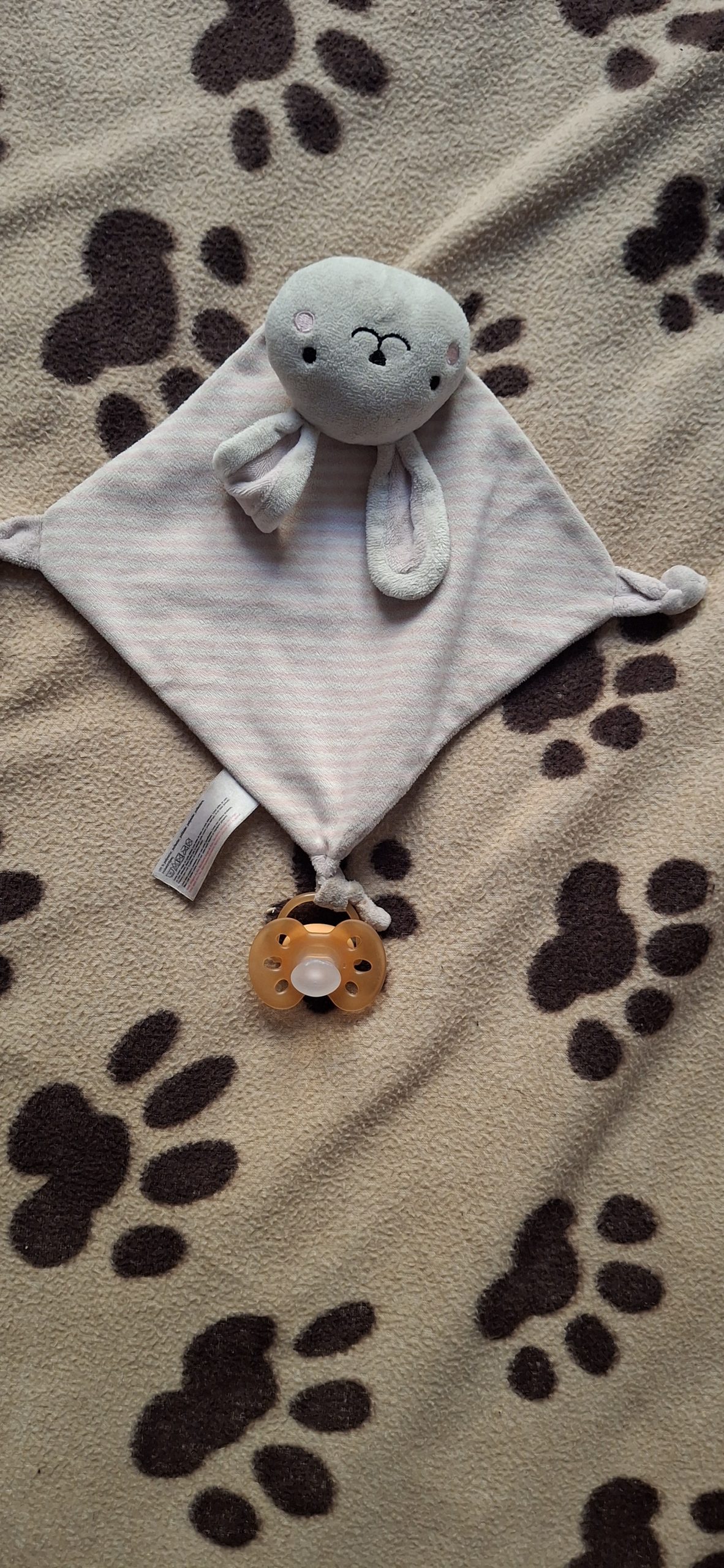 Objet trouvé : J'ai trouvé un doudou lapin plat qui a un grelot dans la tete avec une tetine orange,la partie plate carré est rayer rose et blanche (matière : 100% polyester)