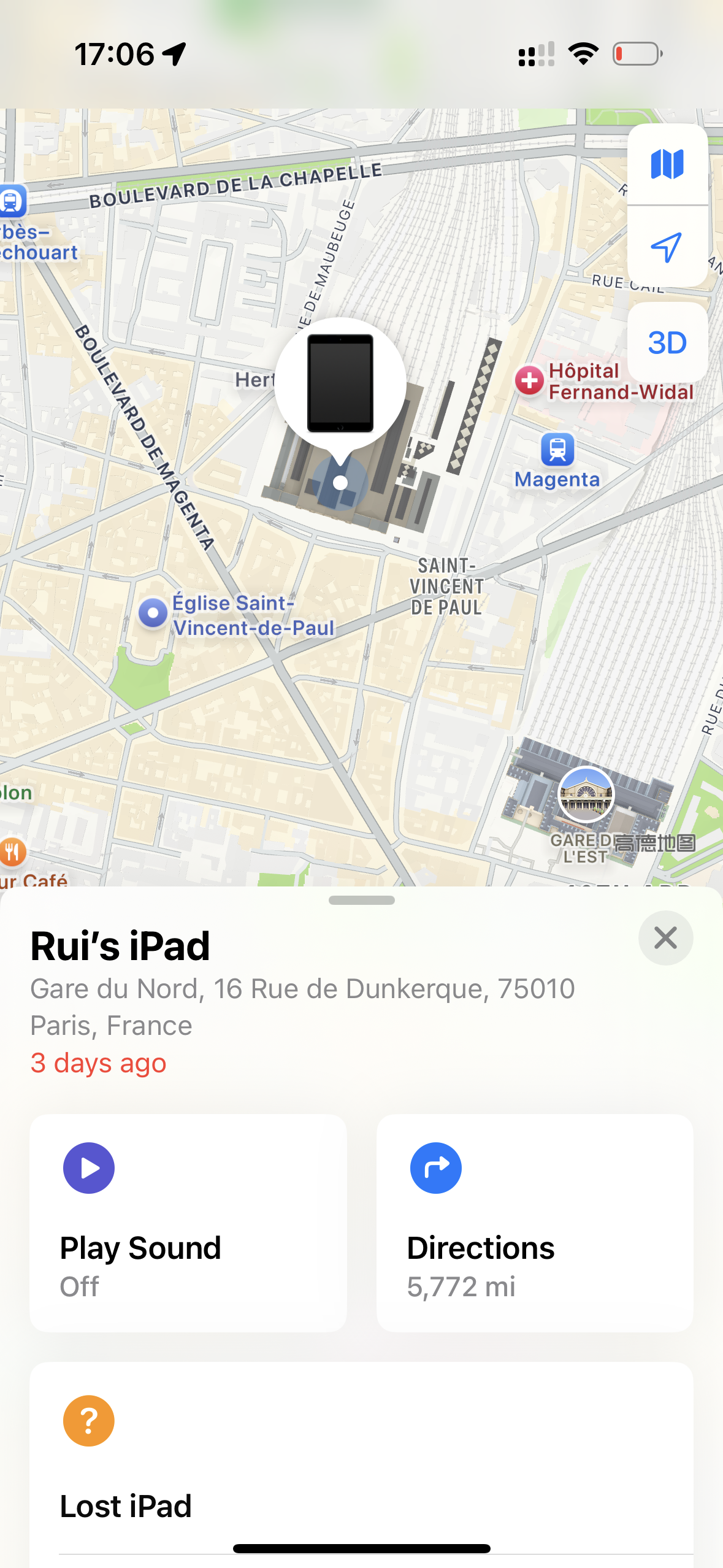 ℹ️ Circonstances de perte : Je l’ai perdu dans le sac/filet devant mon siège (attaché au siège devant moi), car j’ai oublié de le prendre en descendant du train. Le GPS indique qu’il se trouve actuellement à Gare du Nord, Paris.