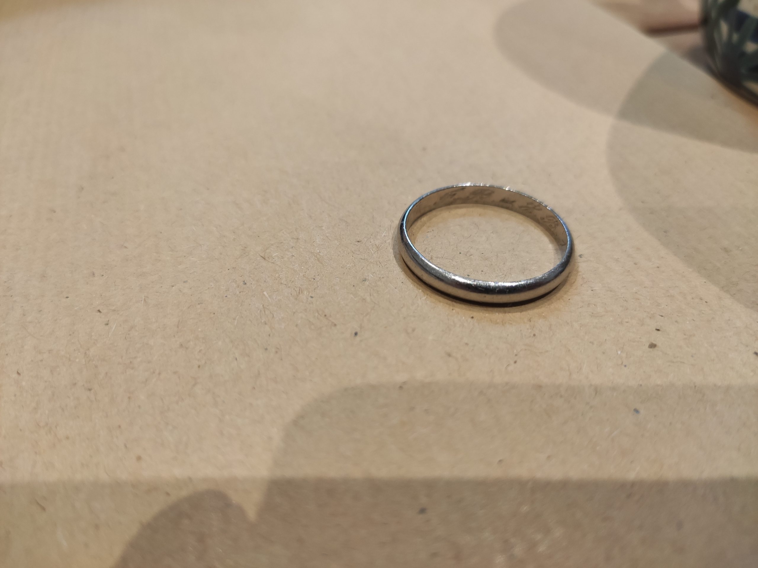 Objet trouvé : Alliance jonc en or blanc ou argent, grise, d'homme, trouvée au croisement entre la rue aux Arènes et la rue Auguste Prost à Metz. Initiales et date du mariage gravées à l'intérieur.