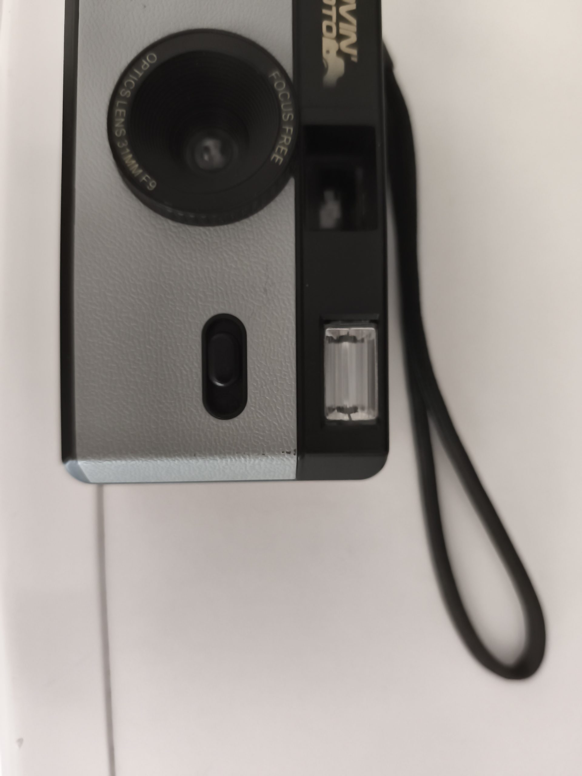 Objet trouvé : Vieil Appareil photo de couleur noir et gris avec lanière