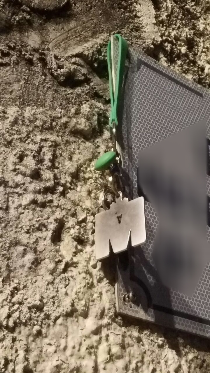 Objet trouvé : badge + accessoires + clés avec un gros M métallique et un petit crystal taillé sombre