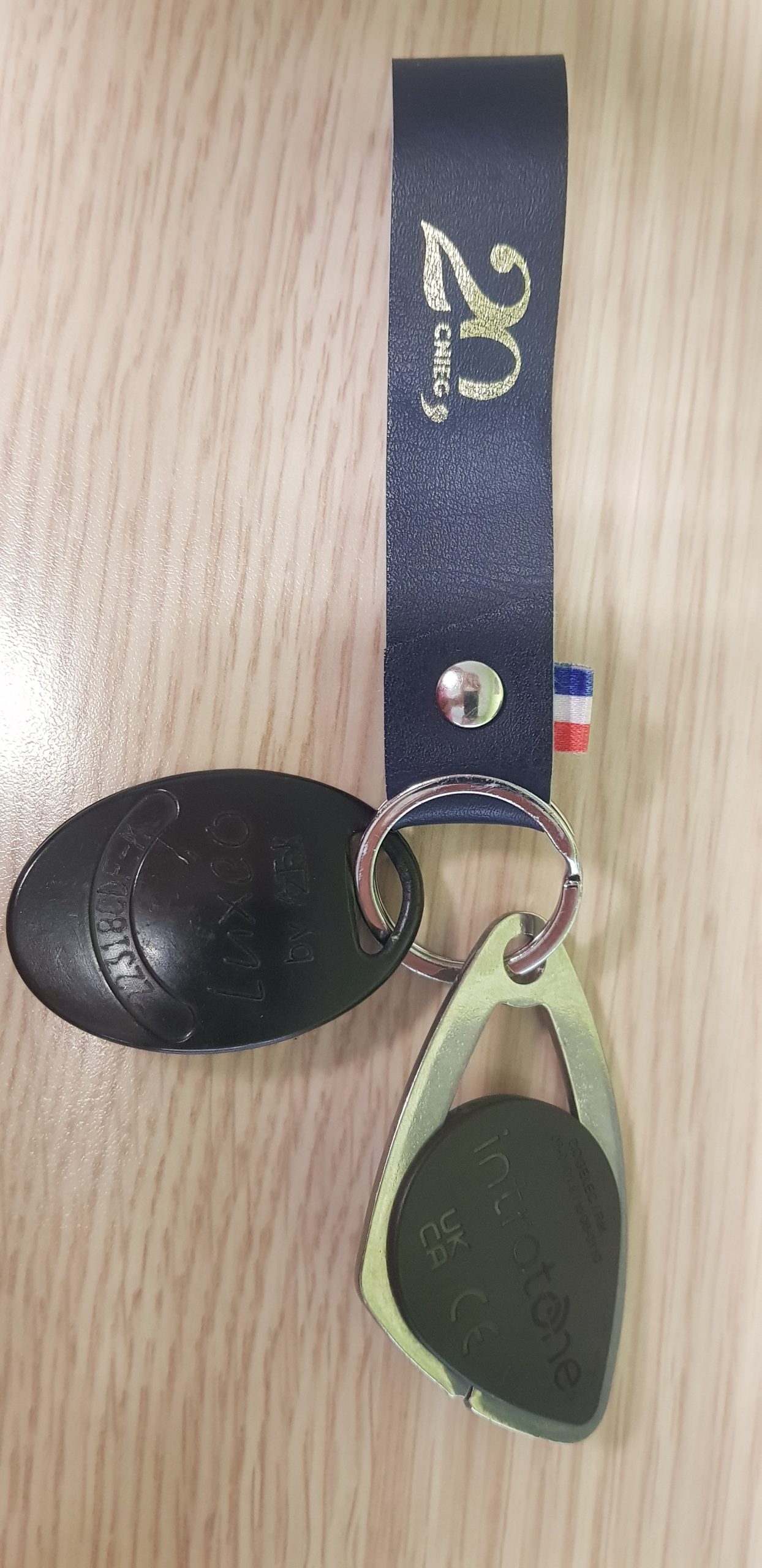 Objet trouvé : Porte badge bleu marine avec inscription 20CNIEG, avec 2 badges: intratone et Luxéo by AZTEK