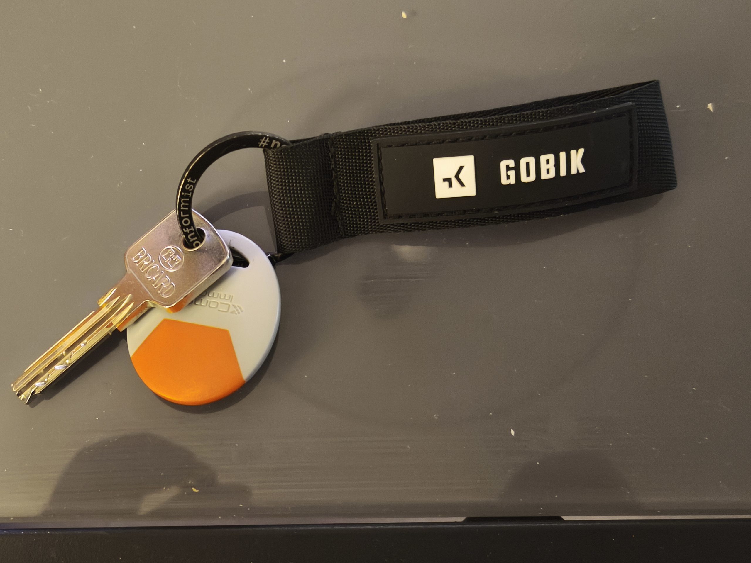 Objet trouvé : Badge COMELIT orange+ clé BRICARD avec porte clé GOBIK