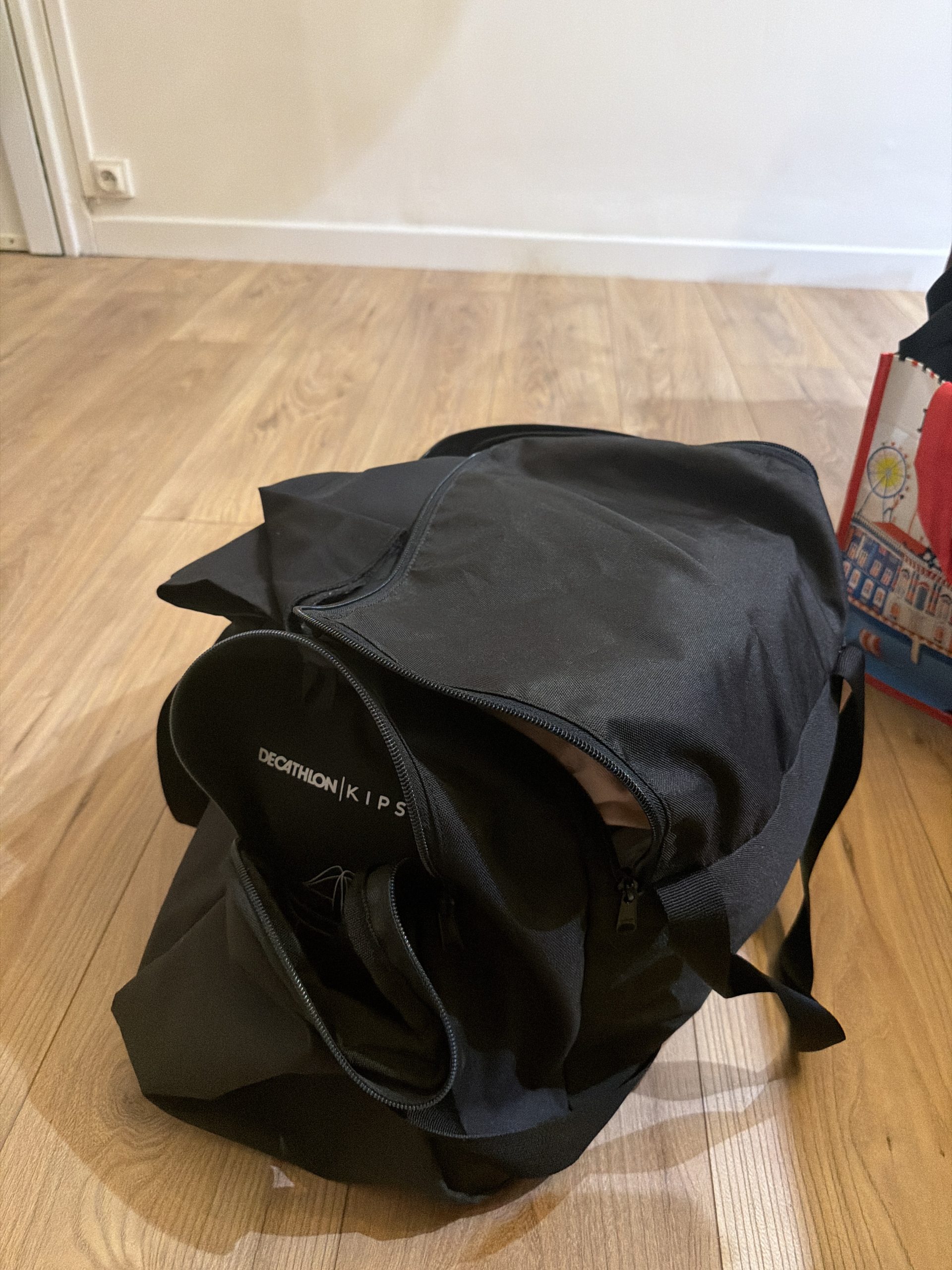 Objet trouvé : Sac de voyage decathlon, noir, en toile, avec les affaire de voyage de la personne