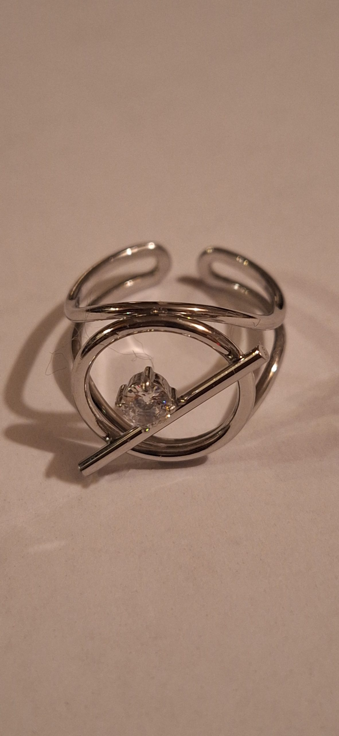 Bague réglable couleur argentée, composée d’un cercle et d’une tige qui barre le cercle dans la diagonale, avec une pierre/strass fixé au milieu
