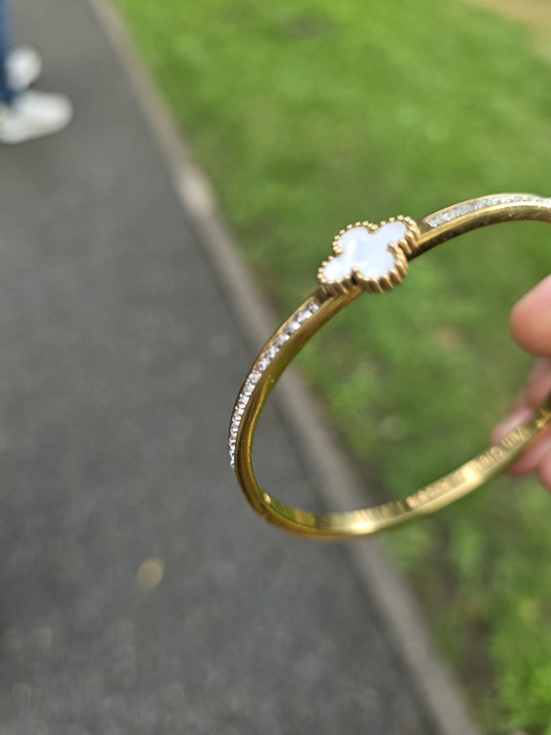 Objet trouvé : Bracelet doré avec un treffle blanc