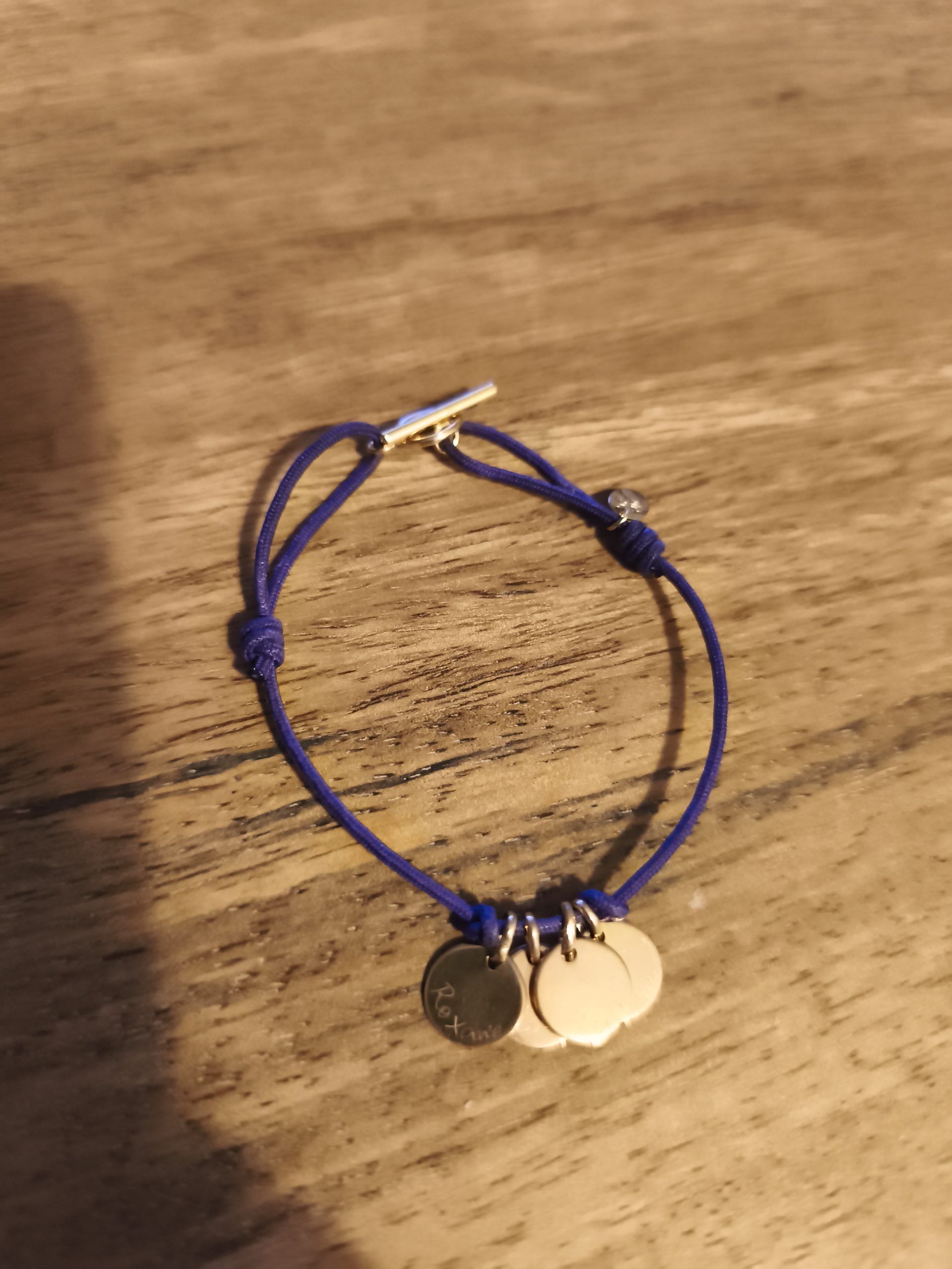 Objet trouvé : Bracelet lien violet avec 4 petits médaillons gravés avec fermoir doré