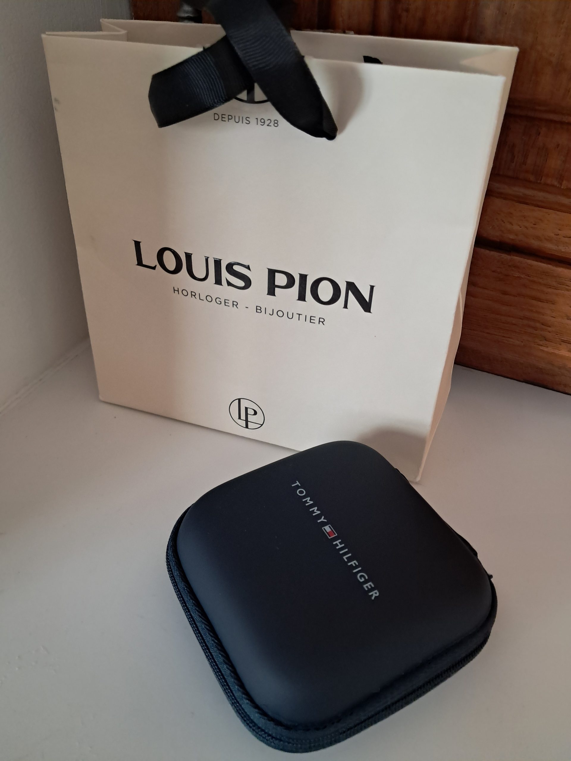 Objet trouvé : Petit paquet de la bijouterie Louis Pion avec petit coffret noir à fermeture éclair contenant un bracelet noir pour homme