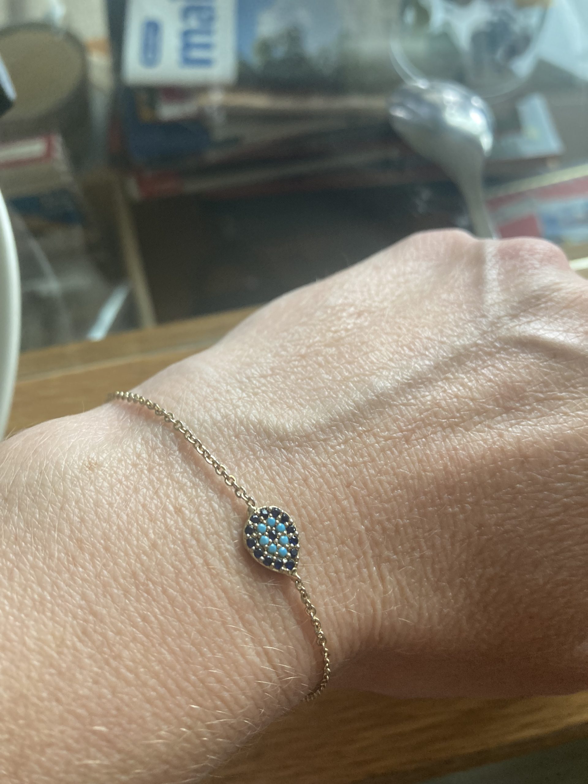 Objet trouvé : Fin bracelet couleur or avec médaille en forme de goutte turquoise et noir