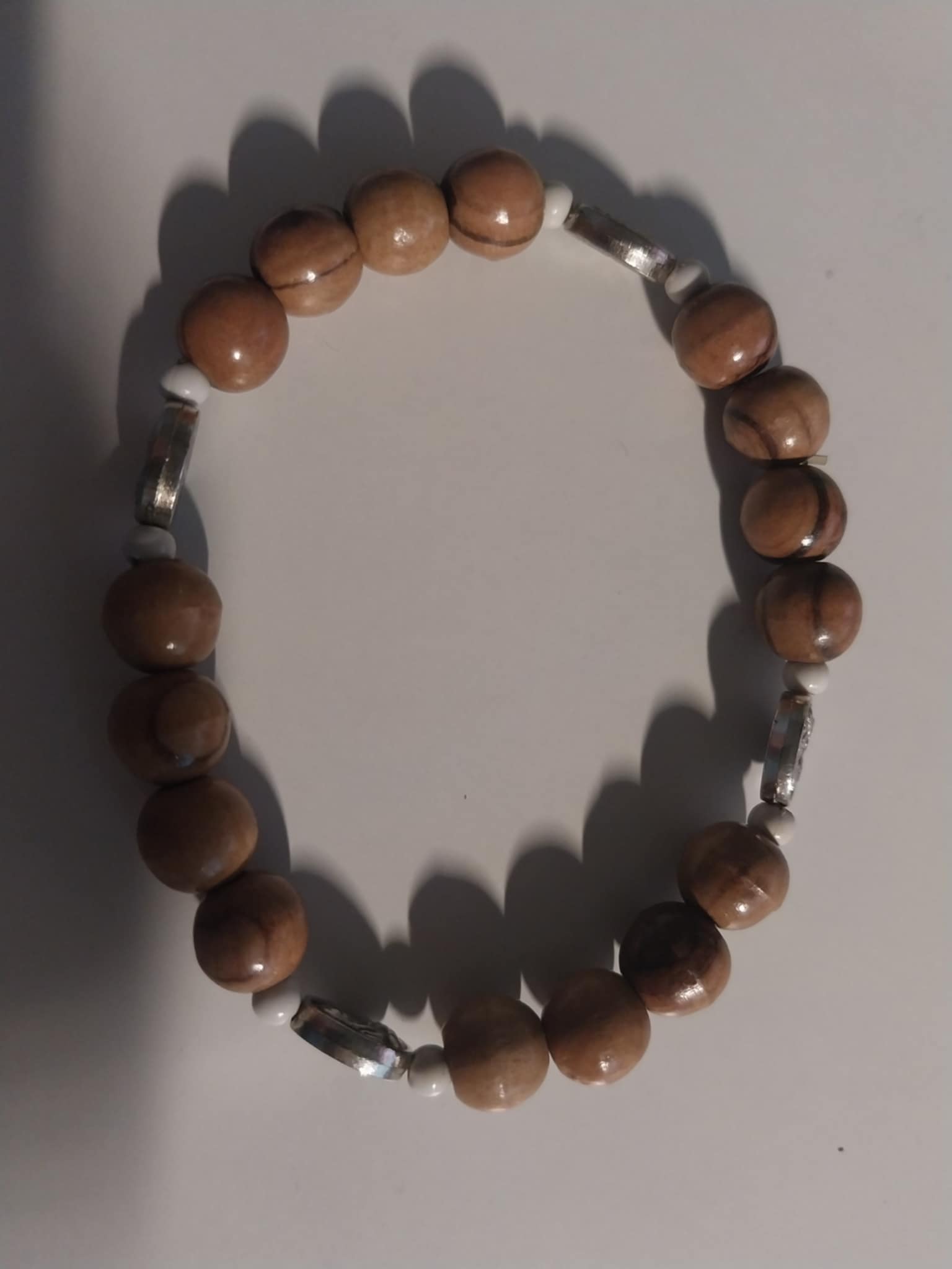 Bracelet religieux à perles en bois avec quatre petits médaillons argentés