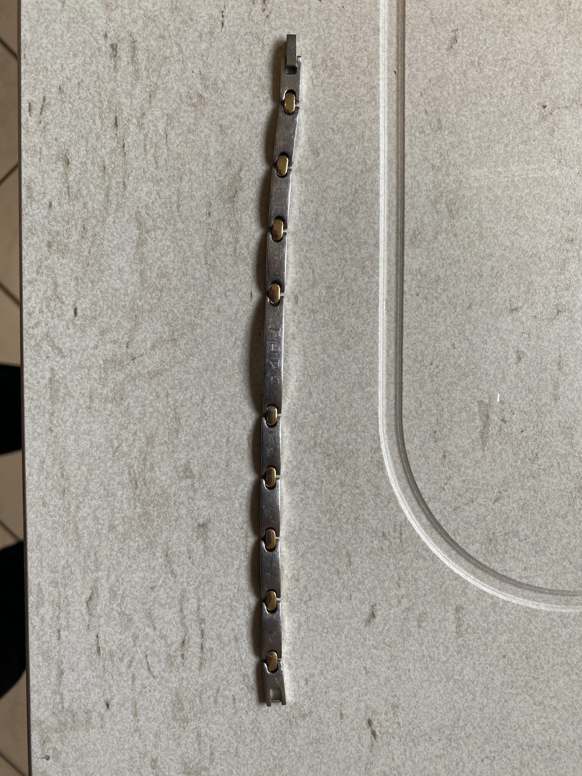 Objet trouvé : Bracelet métallique ou en argent relié avec des petites pièces dorées. Gourmette marquée PAPA