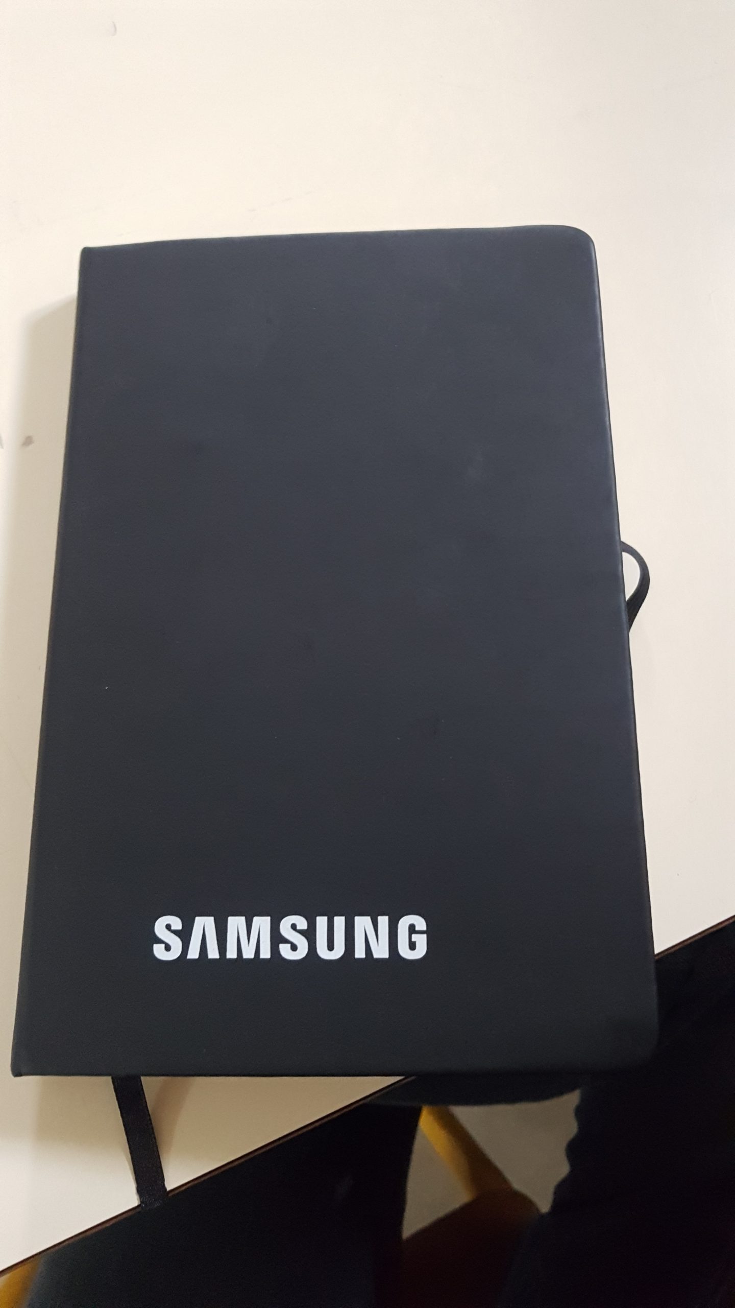 Un carnet de notes noir marqués Samsung avec à l intérieur un stylo et une carte de viste d un député
