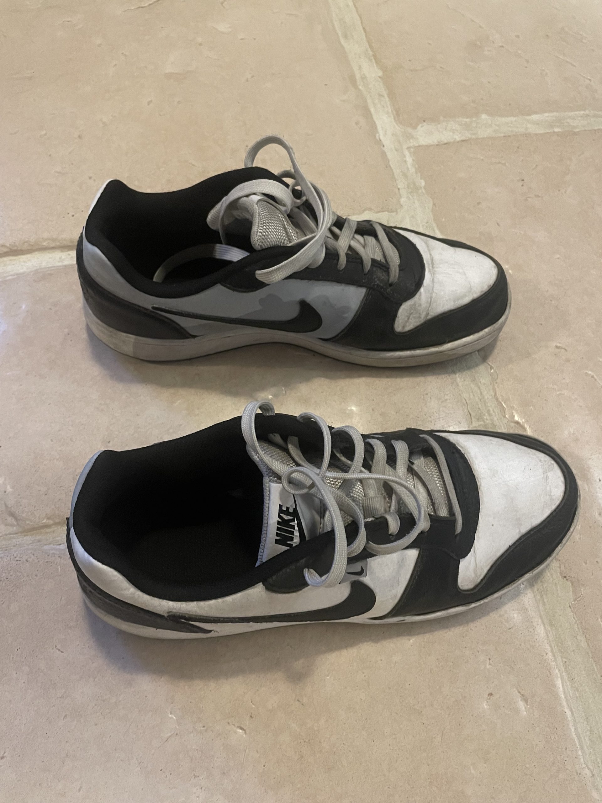Objet trouvé : Les chaussures sont des Nike ebernon low prem. Les chaussures sont blanches, grises et noires de taille 44,5.