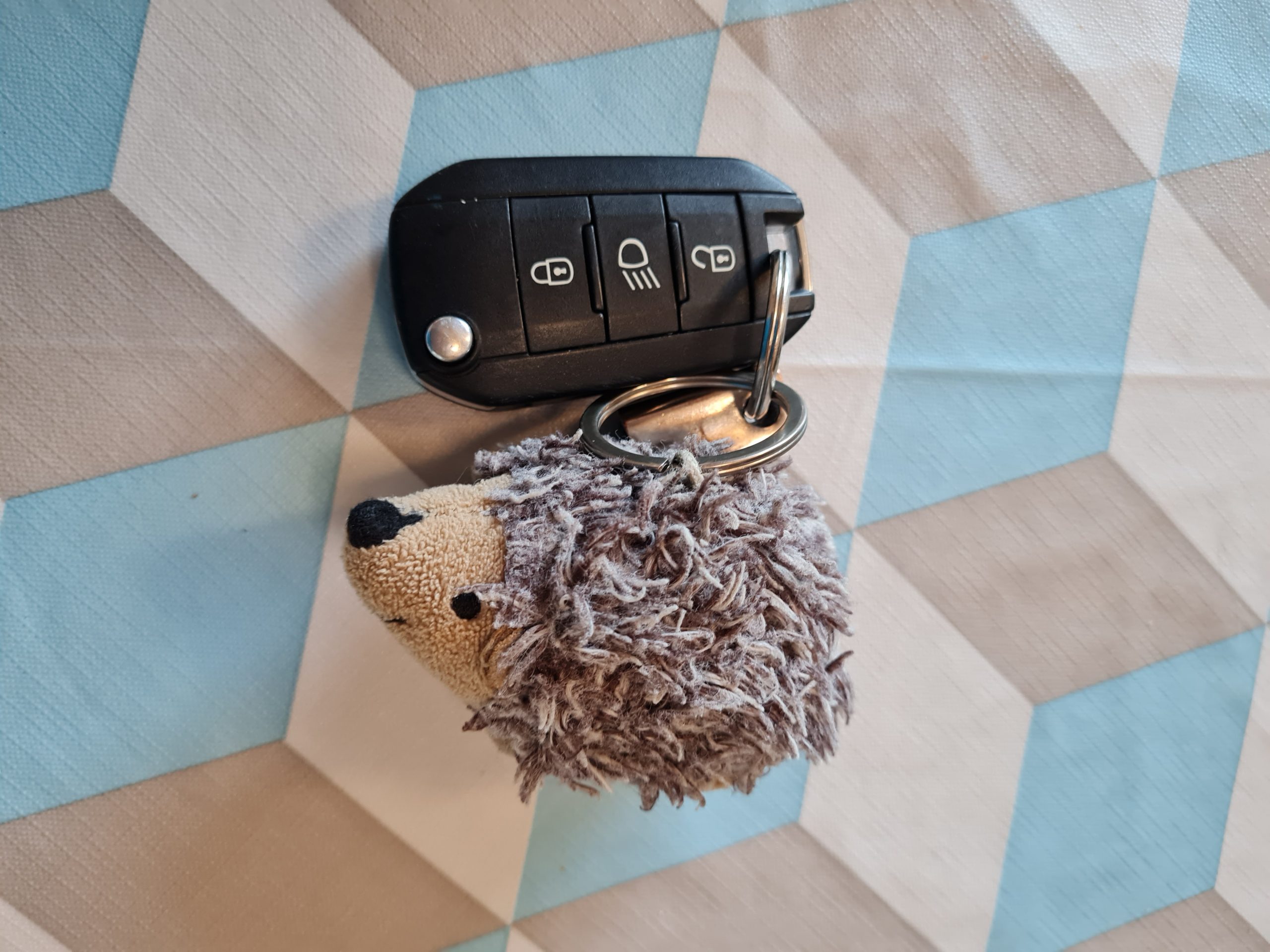 Objet trouvé : Clé d'ouverture fermeture et allumage des feux Peugeot + porte clé casse avec un M + porte cle hérisson en peluche