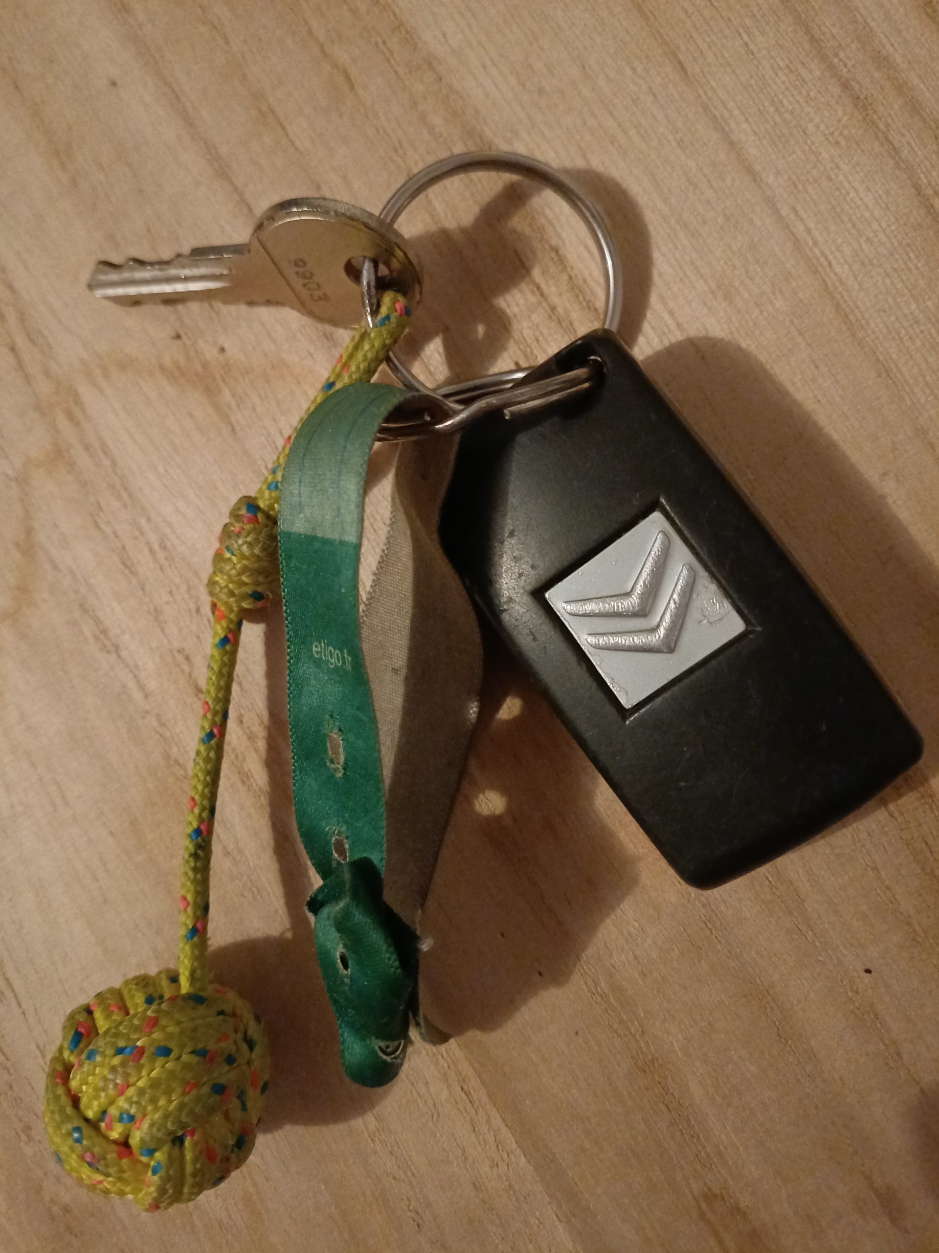 Objet trouvé : Clés de voiture marque Citroën, avec la clef qui peut être rentré dans son boîtier de commande, bracelets tissus vert (snsm) accroché, avec boule en corde couleur jaune et il y a une petite clé accroché.
