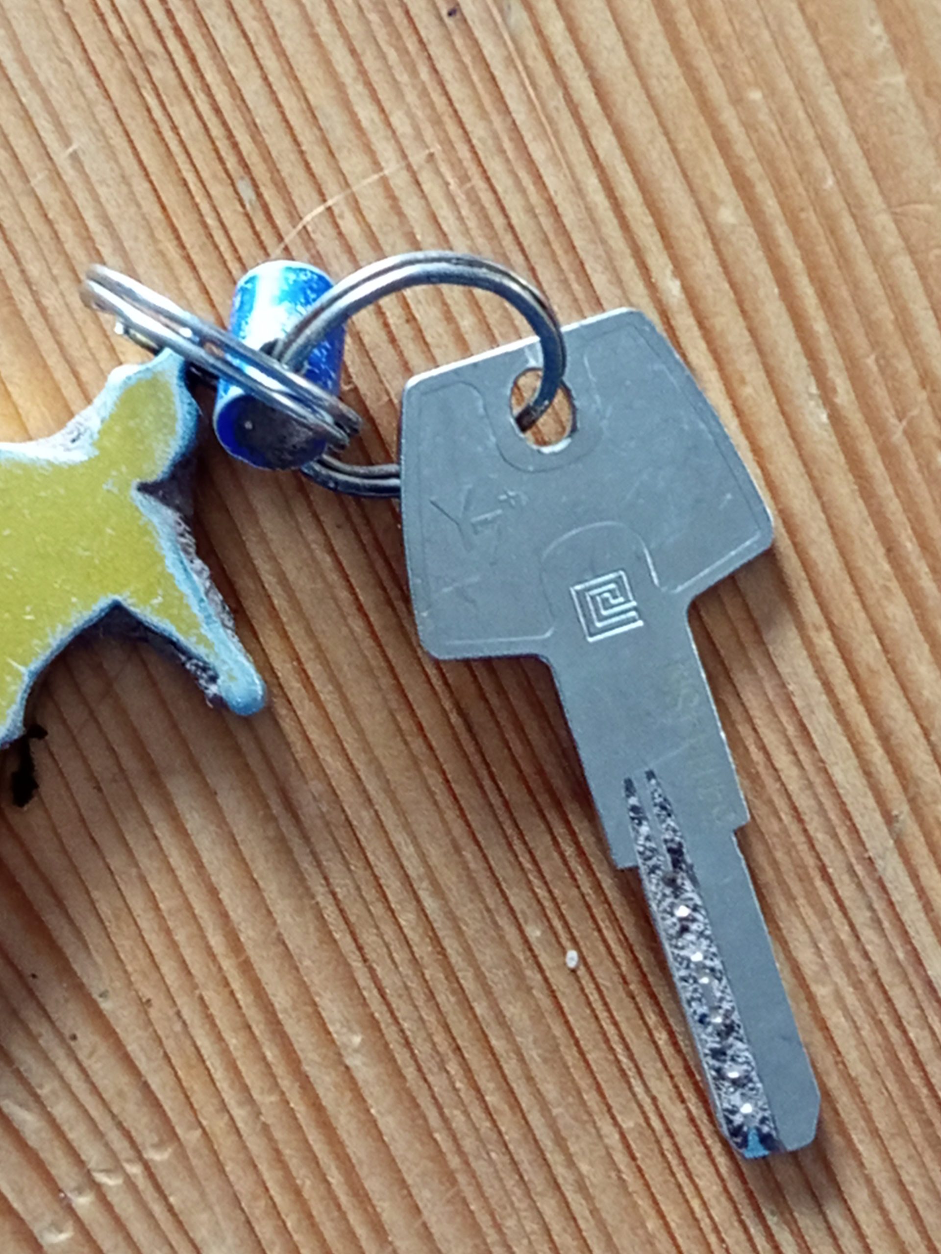 Objet trouvé : Une clé accompagnée d'un porte clé jaune en forme de silhouette.