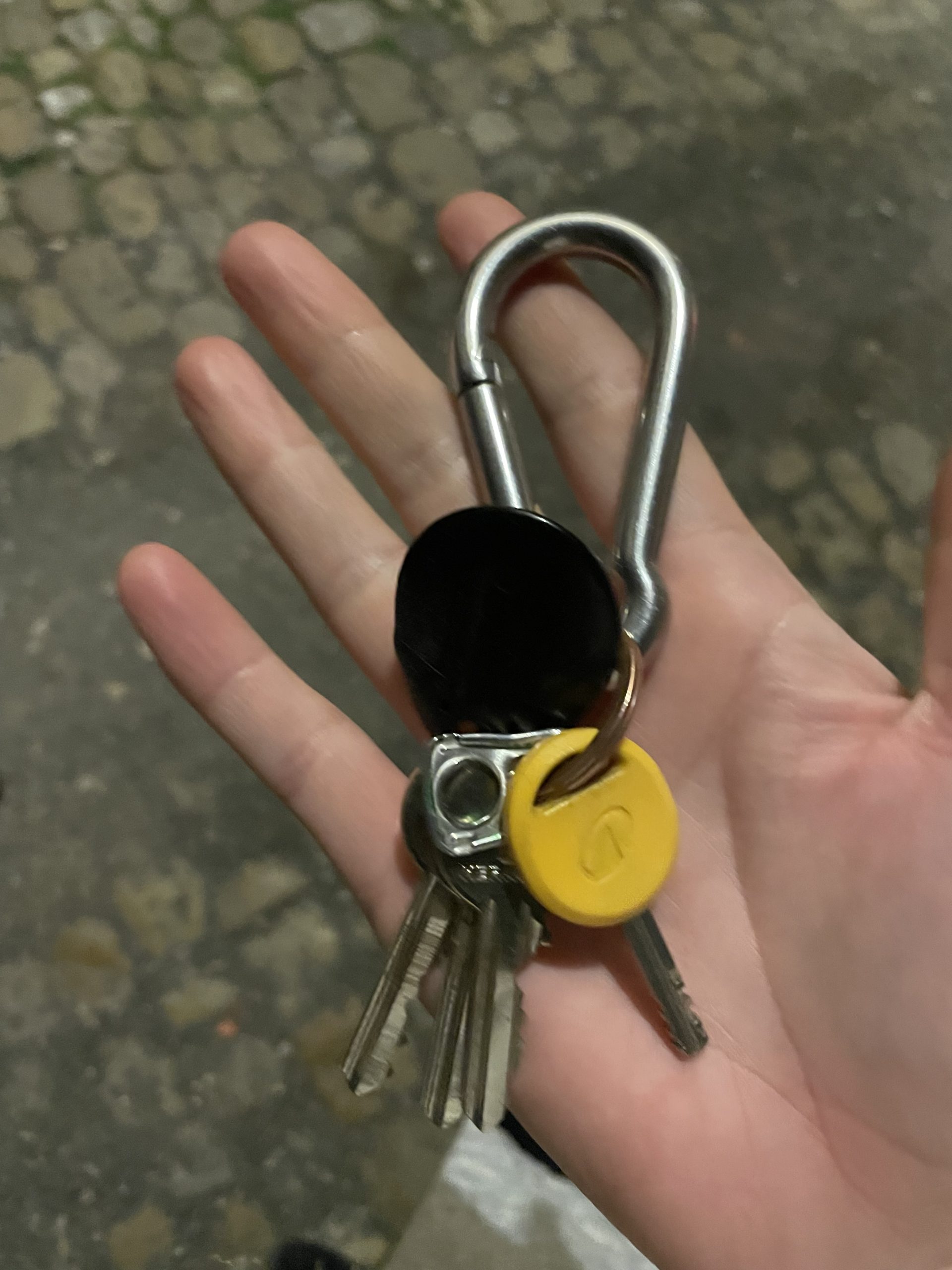 Objet trouvé : Gros mousqueton couleur métal gris aussi large que la paume de ma main + badge noir + un clé orange + 3 clés + opercule de canette