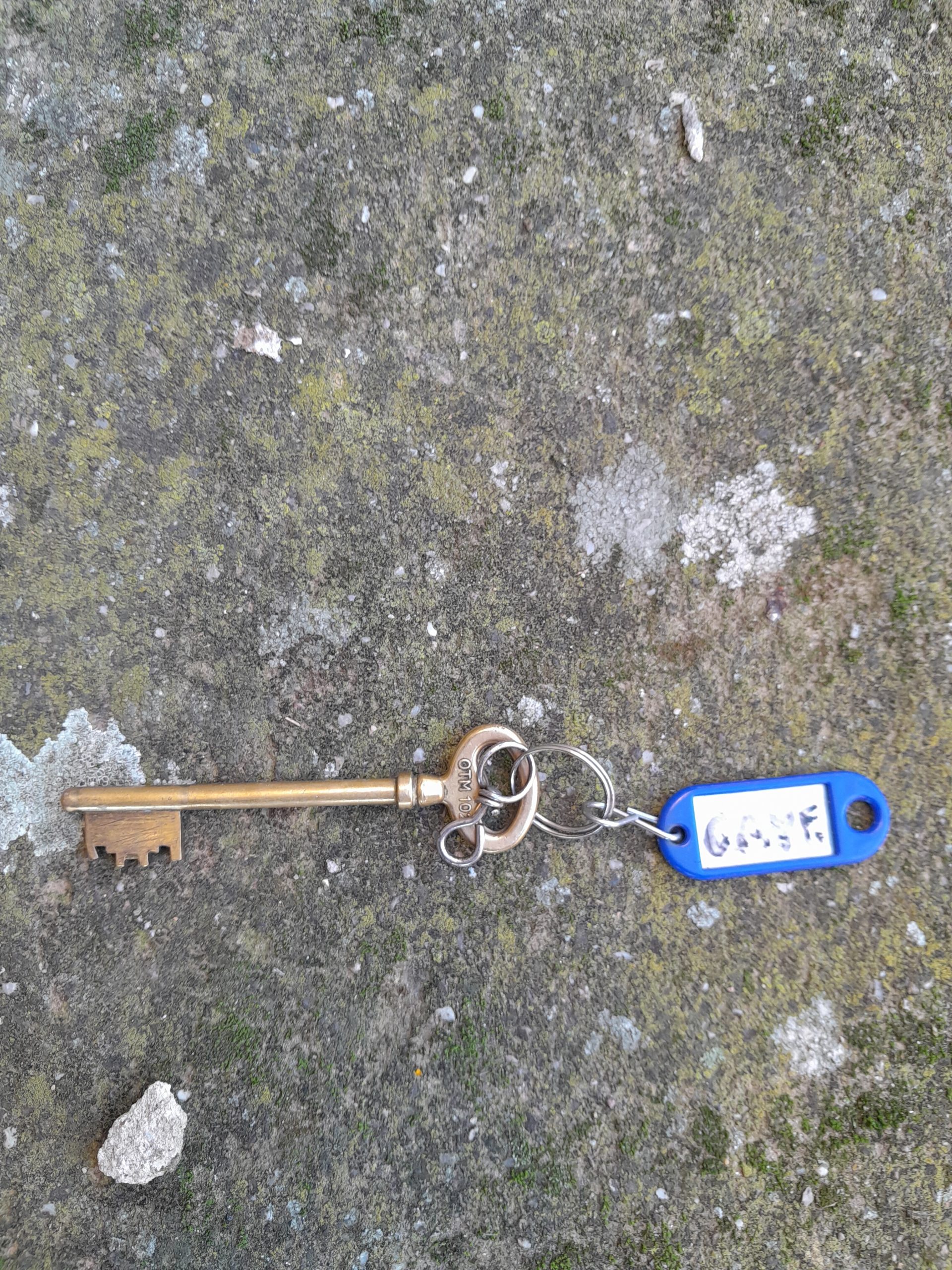 Objet trouvé : Clé laiton de porte mentionné cave porte clé bleu