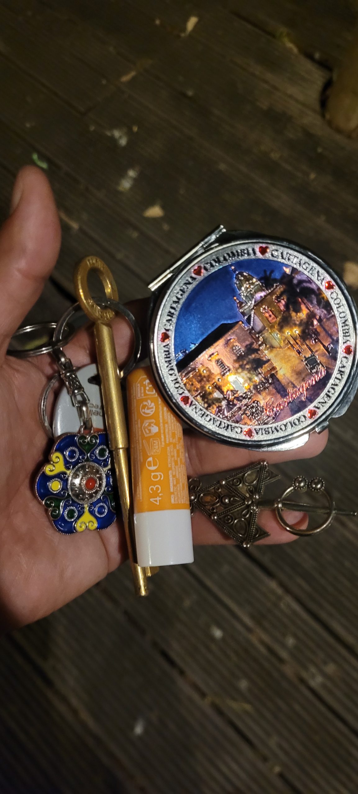 Objet trouvé : Longue Clé dorée de Porte sans souci, avec porte-clefs motifs berbères, plus un miroir de Poche de Colombie, et un stick labial à la vitamine C.