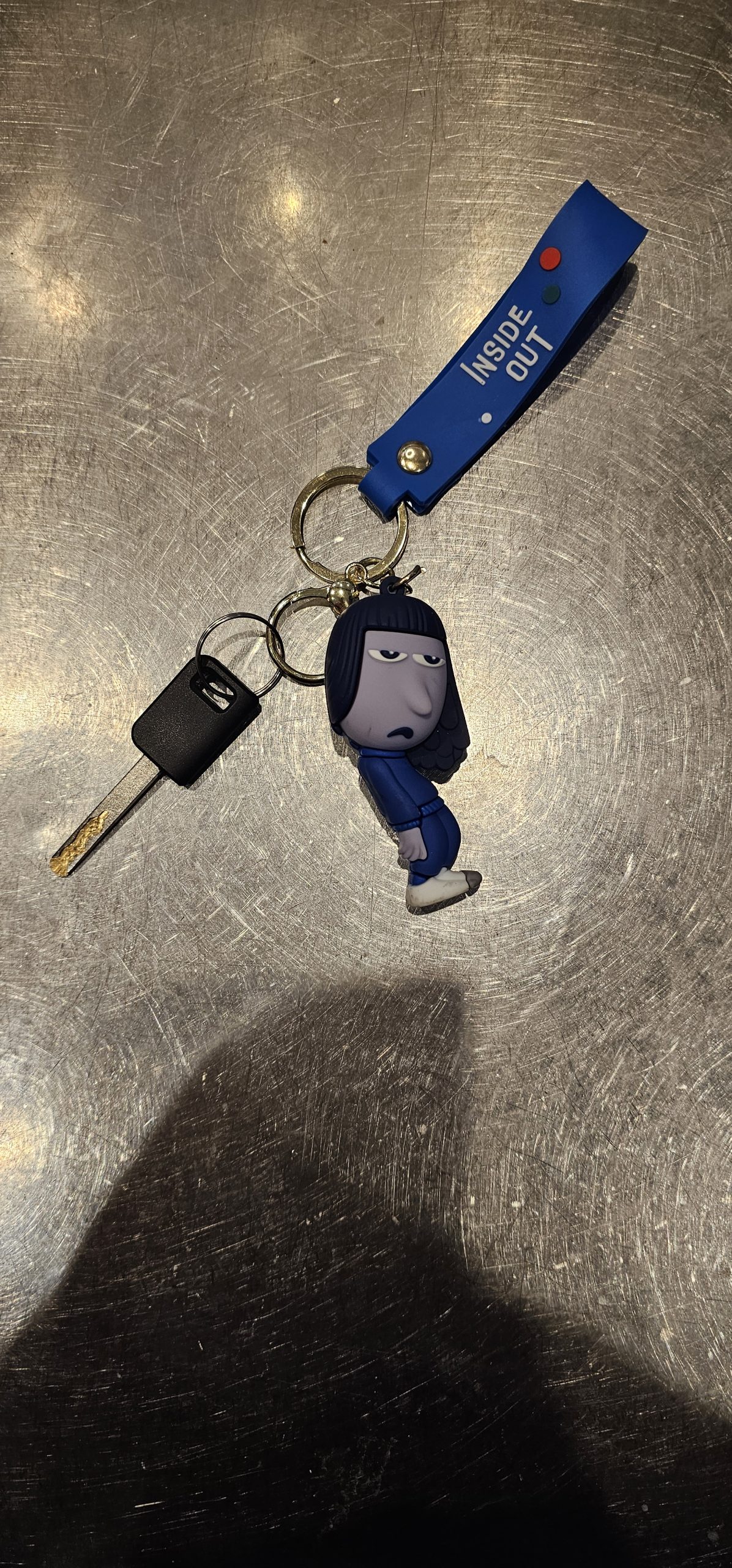 Objet trouvé : Porte clé vice et versa Disney bleu ennui avec une clé noir certainement une clé de scooter
