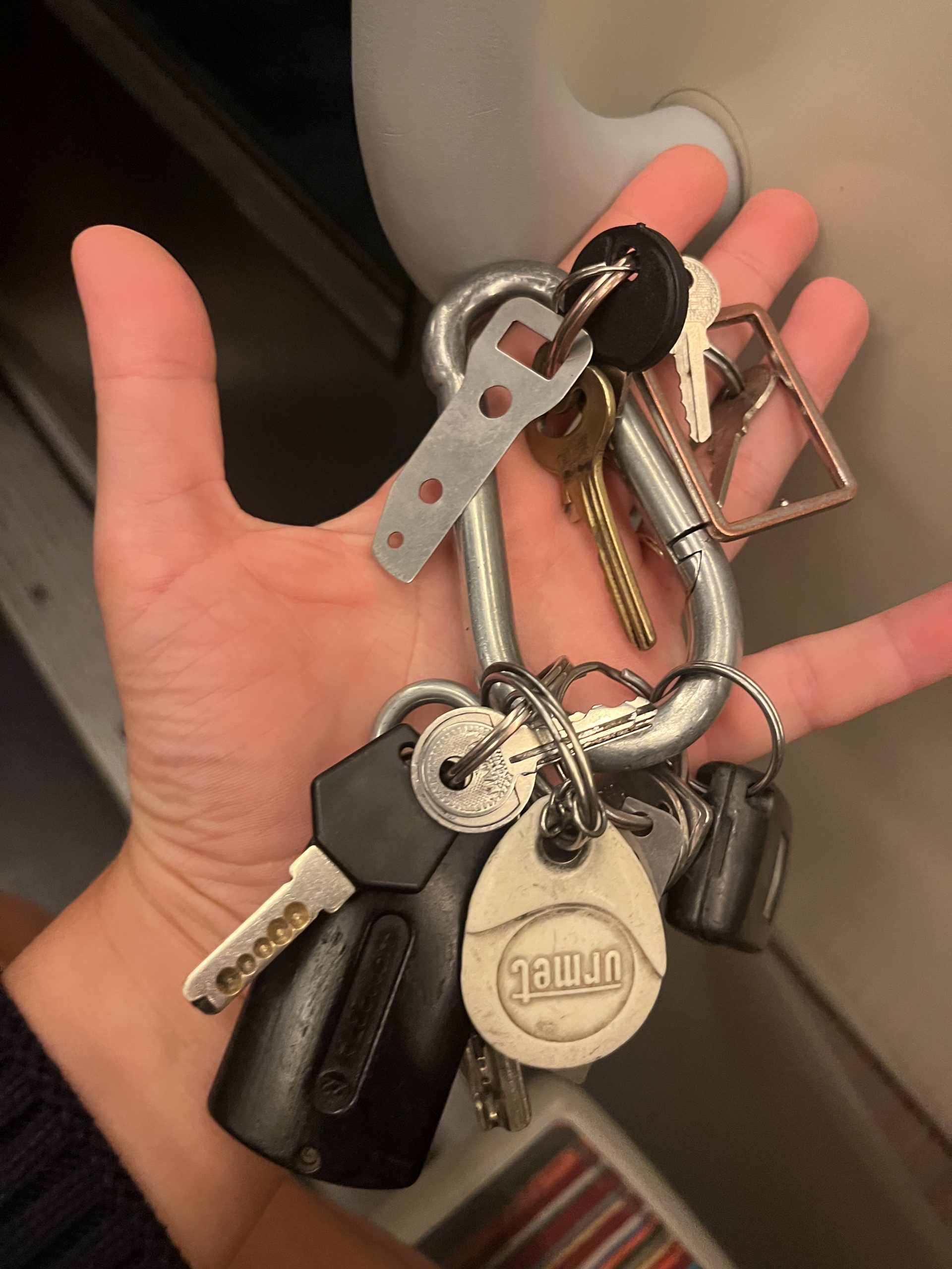 Objet trouvé : Trousseau de clés trouvé dans un panier vélib à la station Michelet Gambetta à Montreuil. Grand mousqueton, clés de voiture, garage etc.