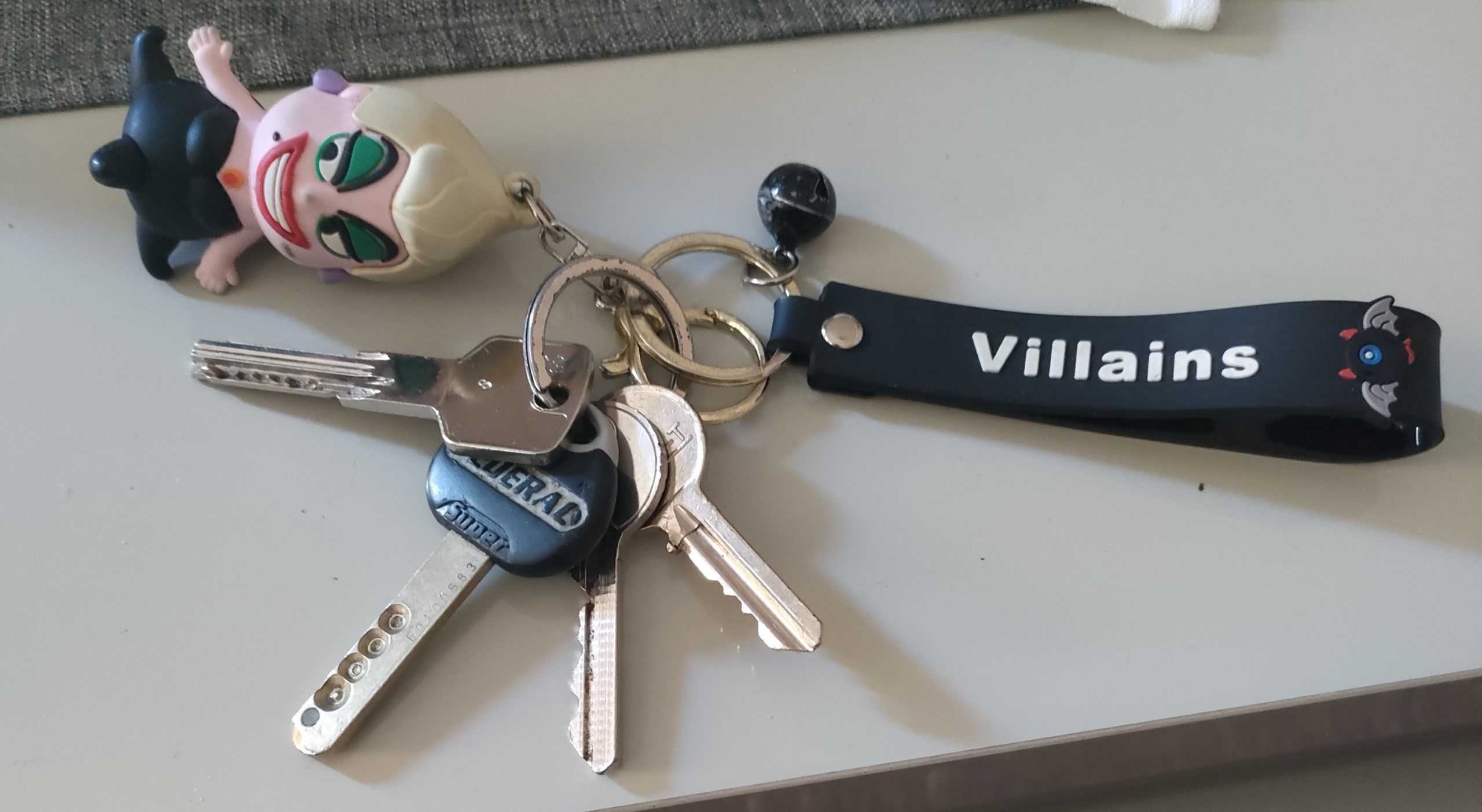 Objet trouvé : Trousseau de clé avec une dragonne où il est écrit "Vilains"