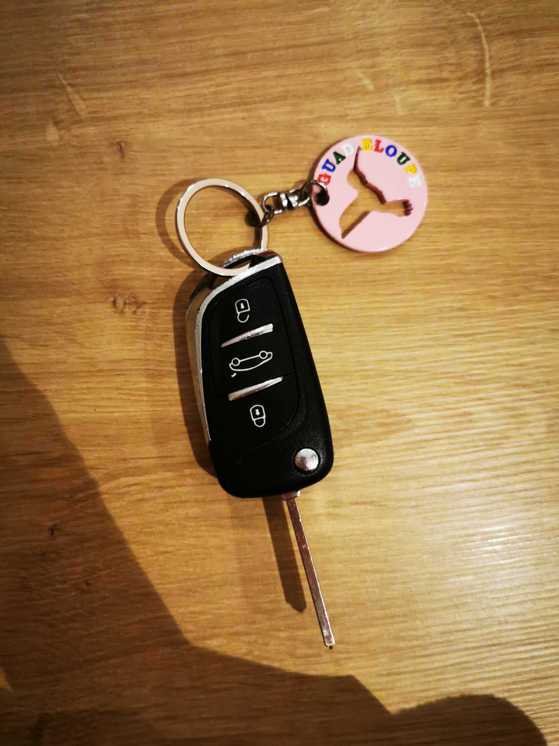 Objet trouvé : Clef de voiture avec un porte-clef rose Guadeloupe, trouvée à Saint Martin du bec près du centre Durand Viel.