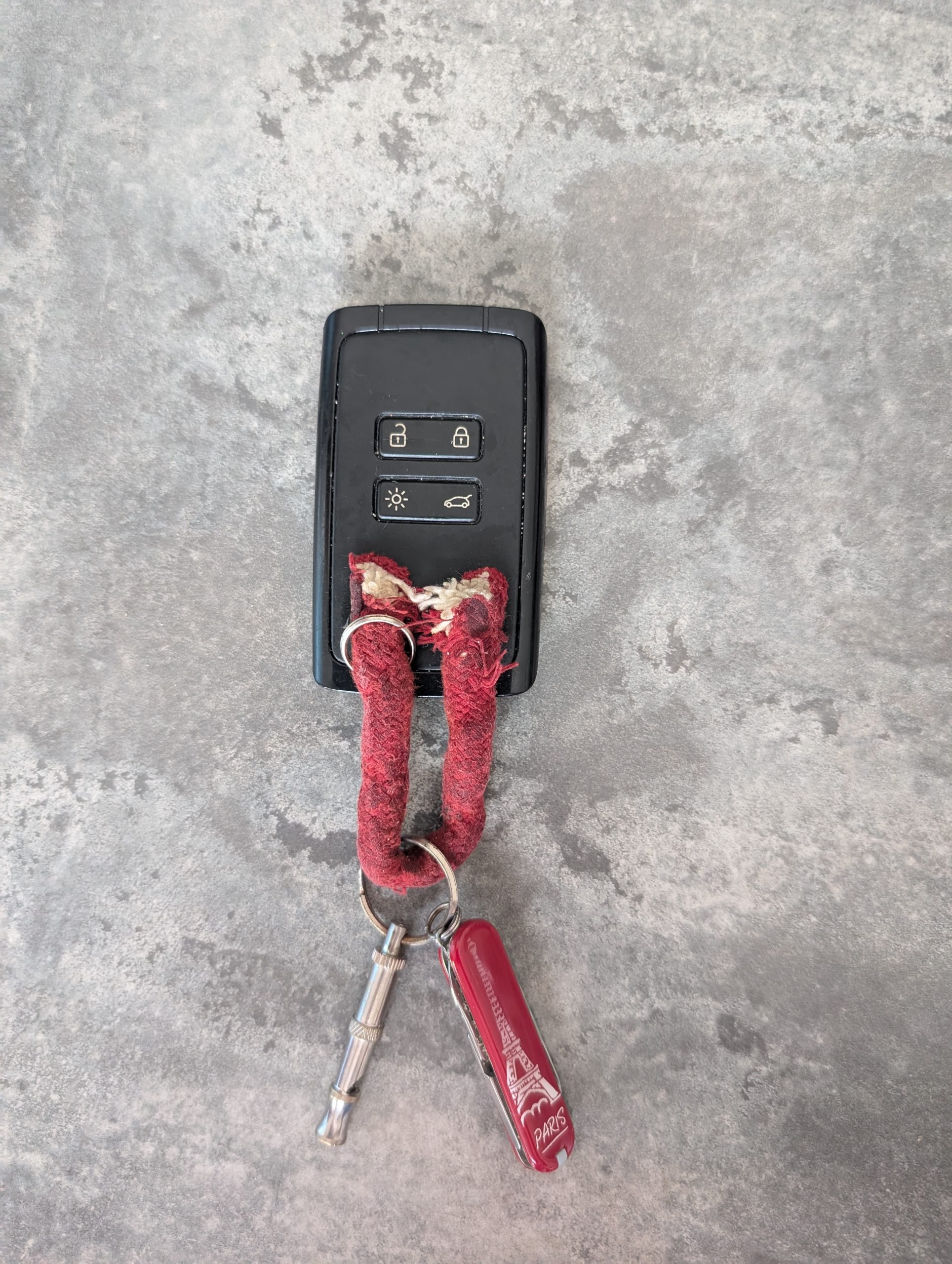 Objet trouvé : Une clé électronique Renault, sur un même porte-clé avec un petit couteau suisse gravé d'une tour Eiffel et un sifflet à ultrasons. + Cordon rouge fixé sur le boitier