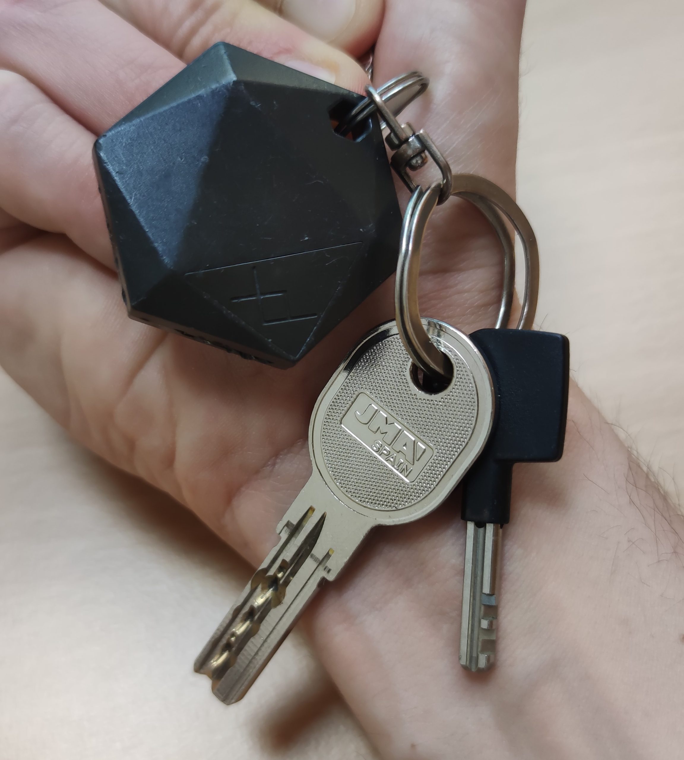 Objet trouvé : Un trousseau de 2 clés. Une petite type cadenas de vélo (elops), une plus grosse en metal type serrure sécurisée (à points). Il y a aussi un badge magnétique de forme hexagonale. Un porte clef rond et bleu, blanc et métal avec une grosse inscription dessus est également accroché (masqué pour la question secrète).
