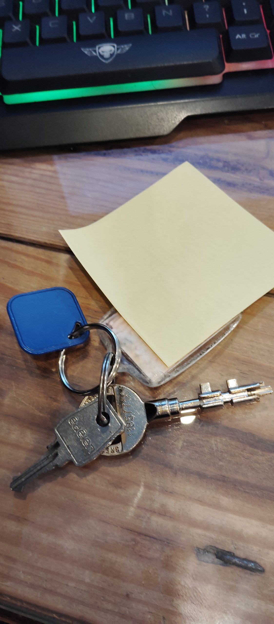 Objet trouvé : un clef dorée de marque vigie piraten 11b5771k pour porte d'entrée un petite clef en argent n 9272 un badge d'entrée de couleur bleu un porte clef avec deux photo une avec un enfant et une autre avec deux femmes