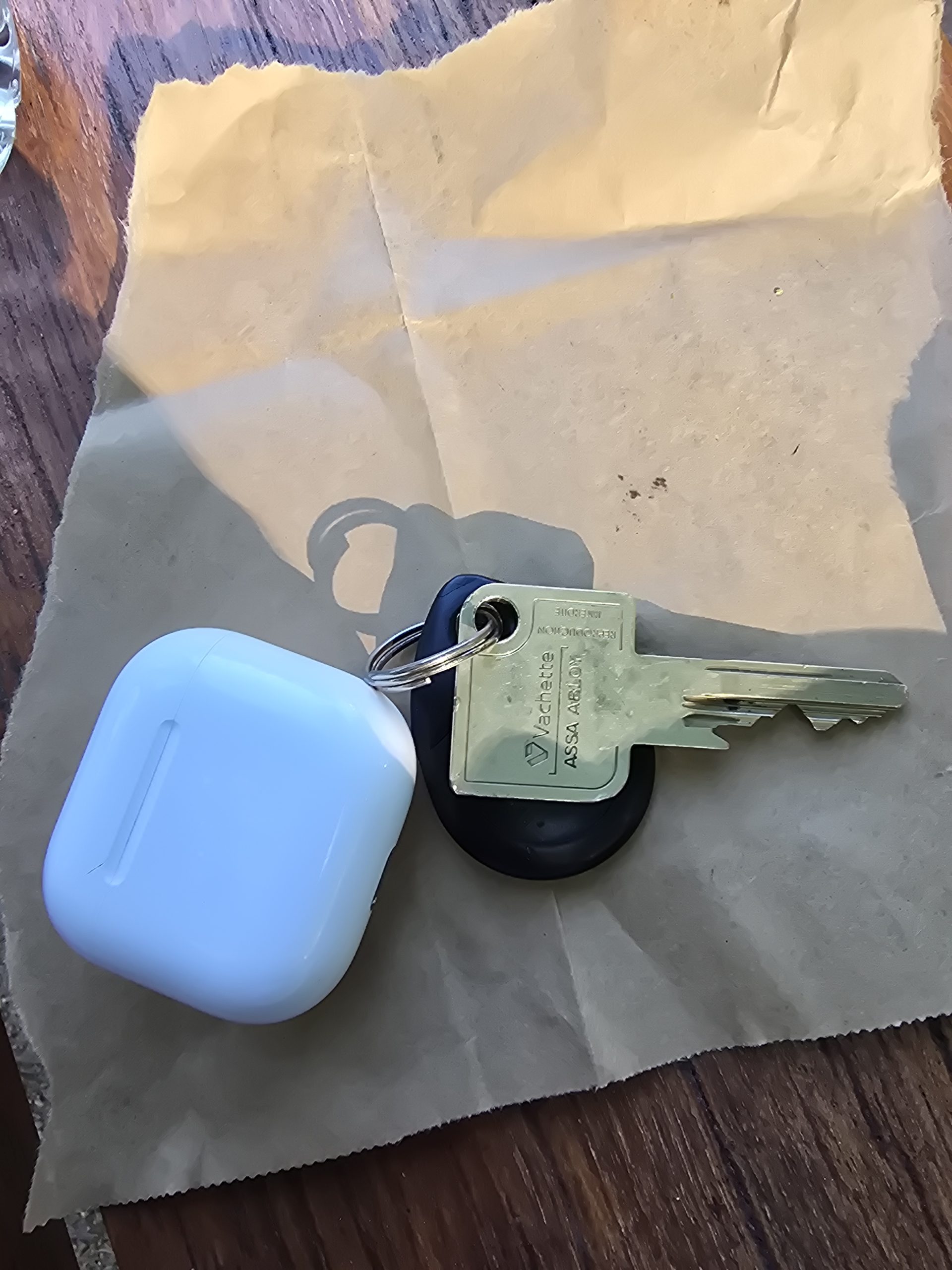 Clef unique retrouvée derrière un banc près de la statue "aux mère françaises" dans un jardin accompagnée d'une boîte d’airpod
