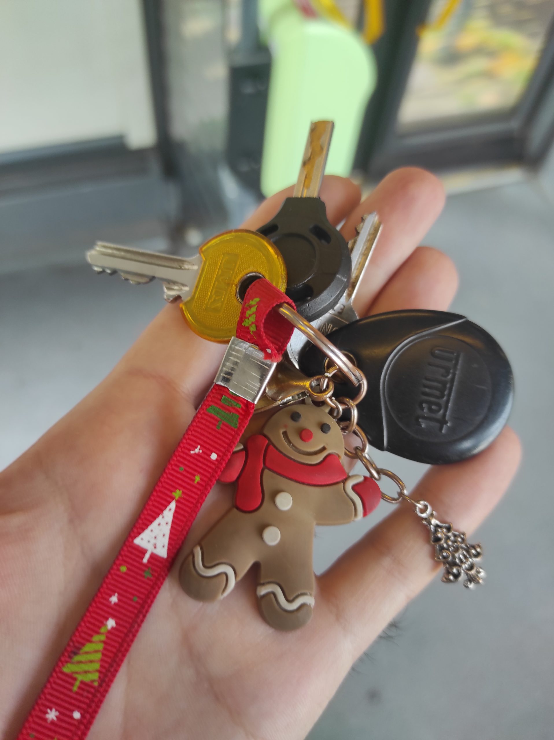 Objet trouvé : Un trousseau de clés a été retrouvé : trois clés, un badge noir, un porte-clés en forme de bonhomme en pain d'épice, un porte-clés en forme de petit sapin de Noël et un ruban de Noël rouge.