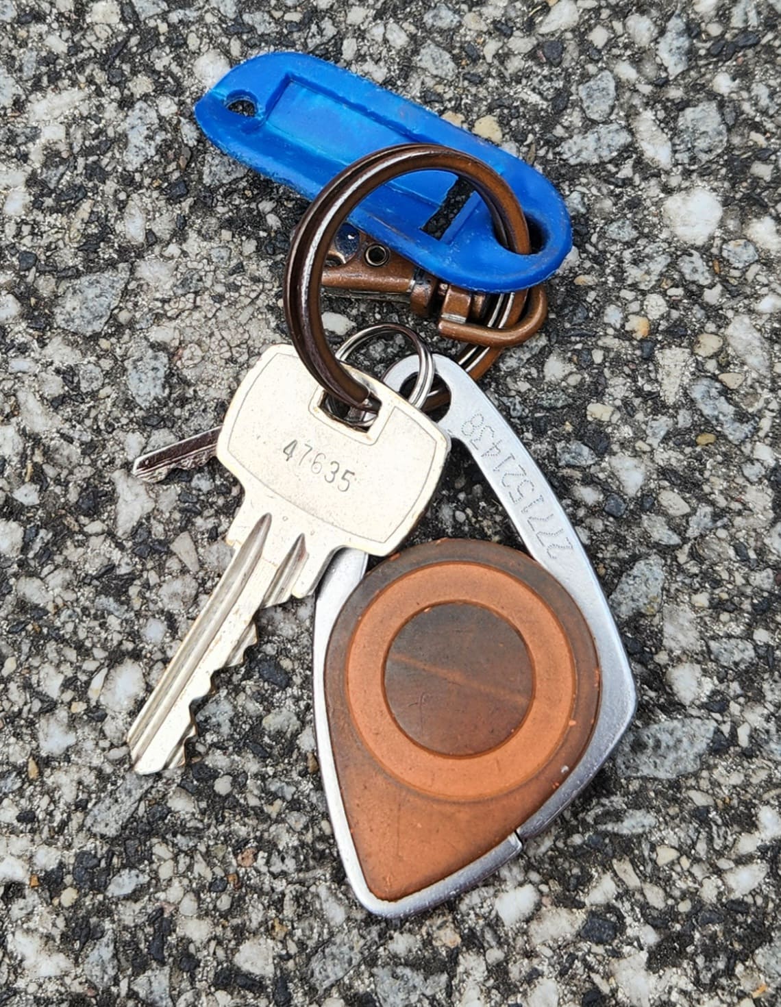 2 clés, une petite et une grande. Un porte-clés bleu en plastique et un porte-clés en métal couleur bronze et marron