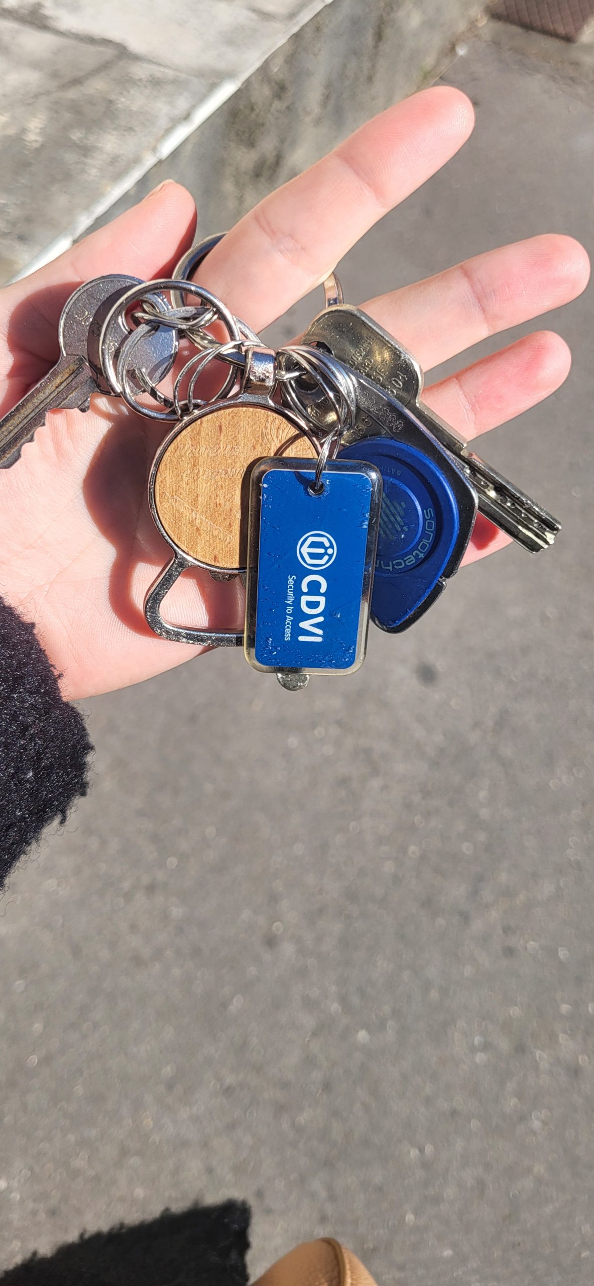 Objet trouvé : Trousseau de clés avec un badge d'accès bleu, un porte clé décapsuleur, et un porte clé CDVI