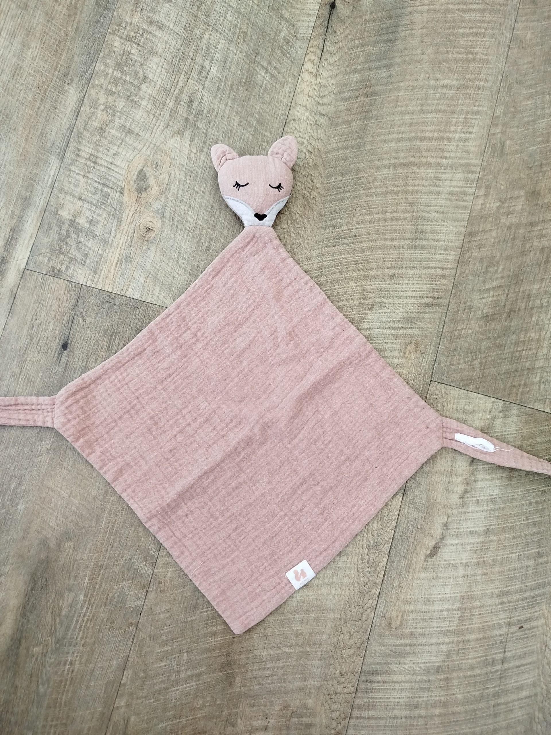 Objet trouvé : Doudou carré tissu rose, tête de renard