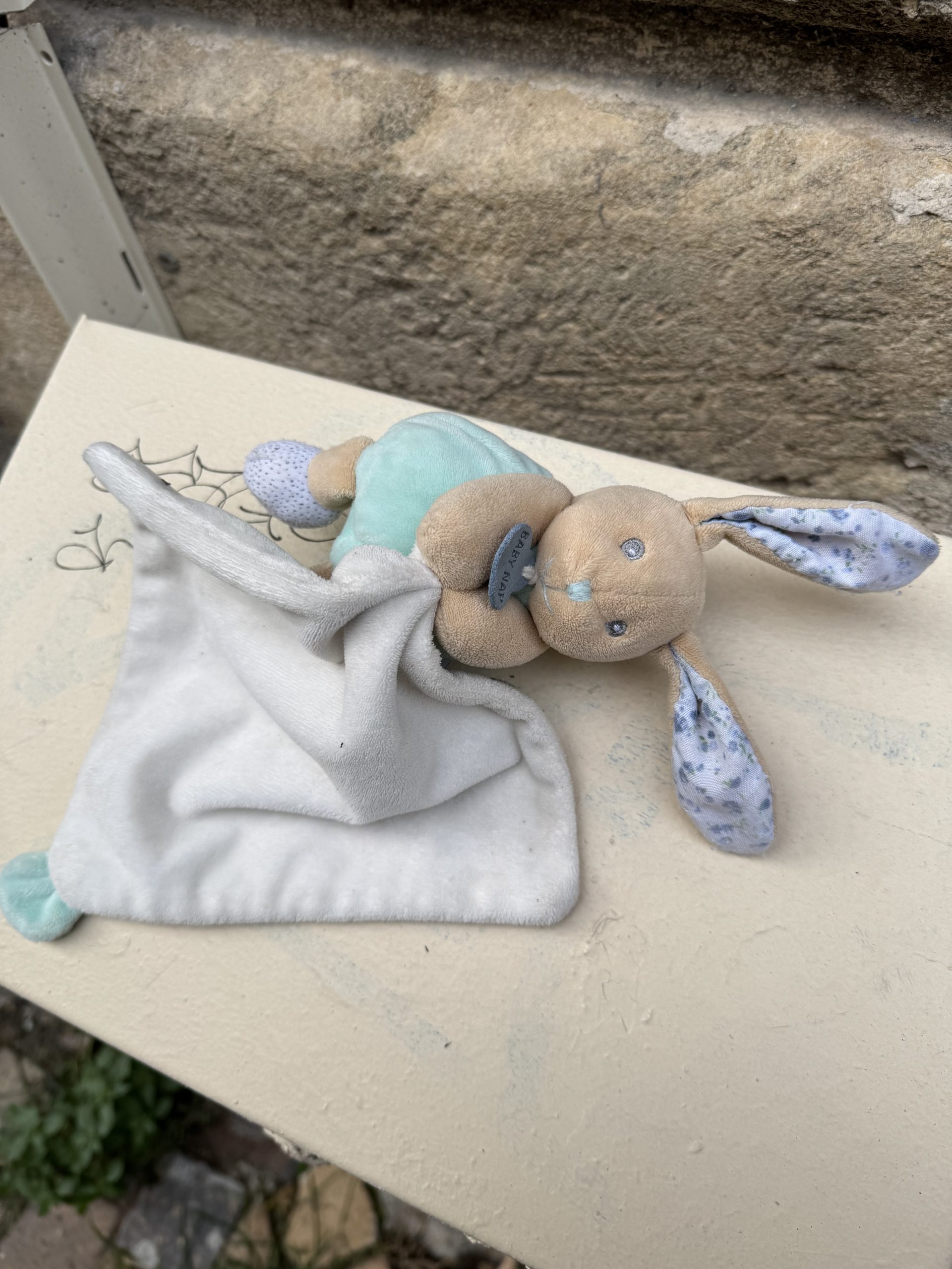 Objet trouvé : doudou lapin beige avec un vêtements cousu bleu et il tient un sorte de mouchoir blanc, le lapin a des fleur à l’intérieur de ses oreilles avec un fond blanc et les pieds du lapins sont à petit pois noir