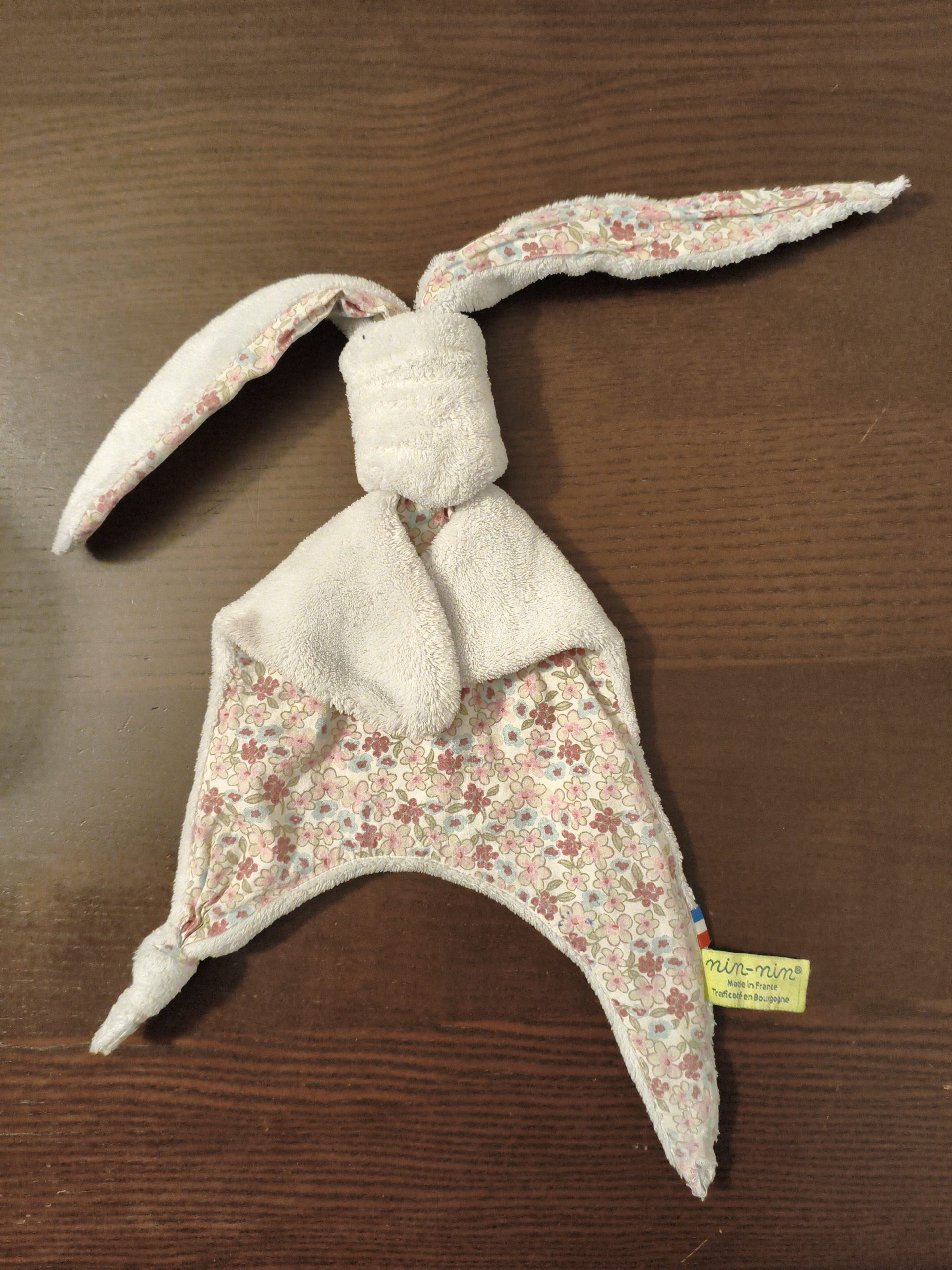 Objet trouvé : Doudou blanc et avec des fleurs, en forme de lapin.