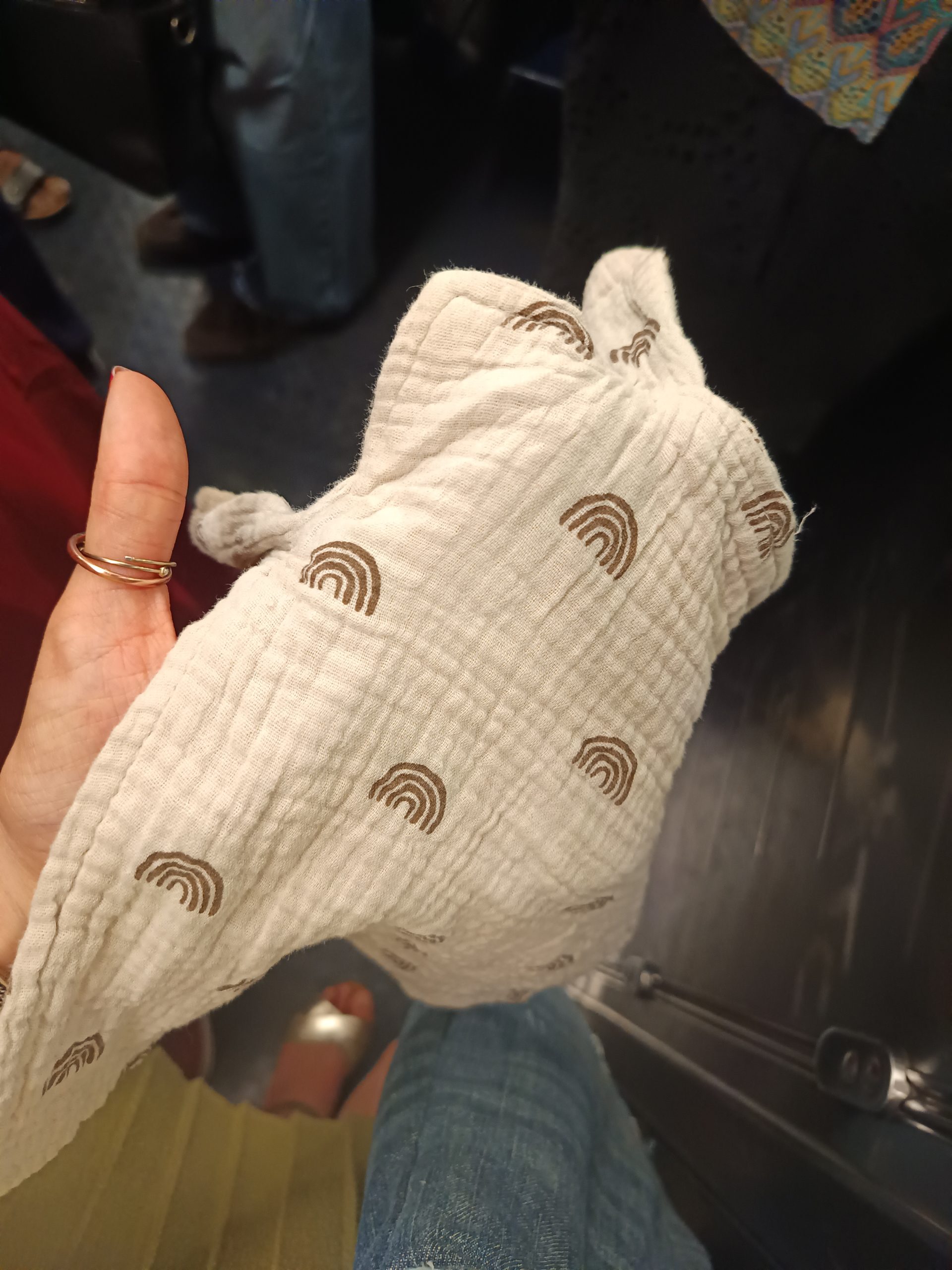 Objet trouvé : Doudou couleur marron claire de forme carrée avec deux longues oreilles. Possède des motifs arc-en-ciel marron foncé.