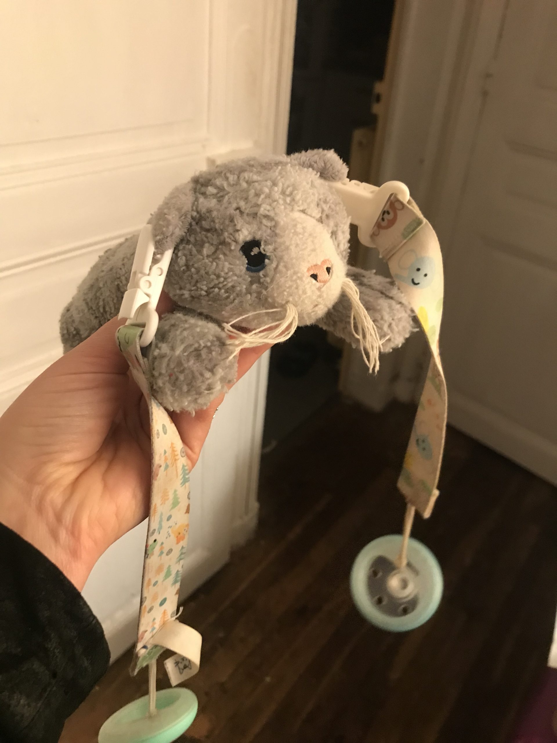 Objet trouvé : Doudou représentant un chaton gris allongé avec deux tétines accrochées aux oreilles
