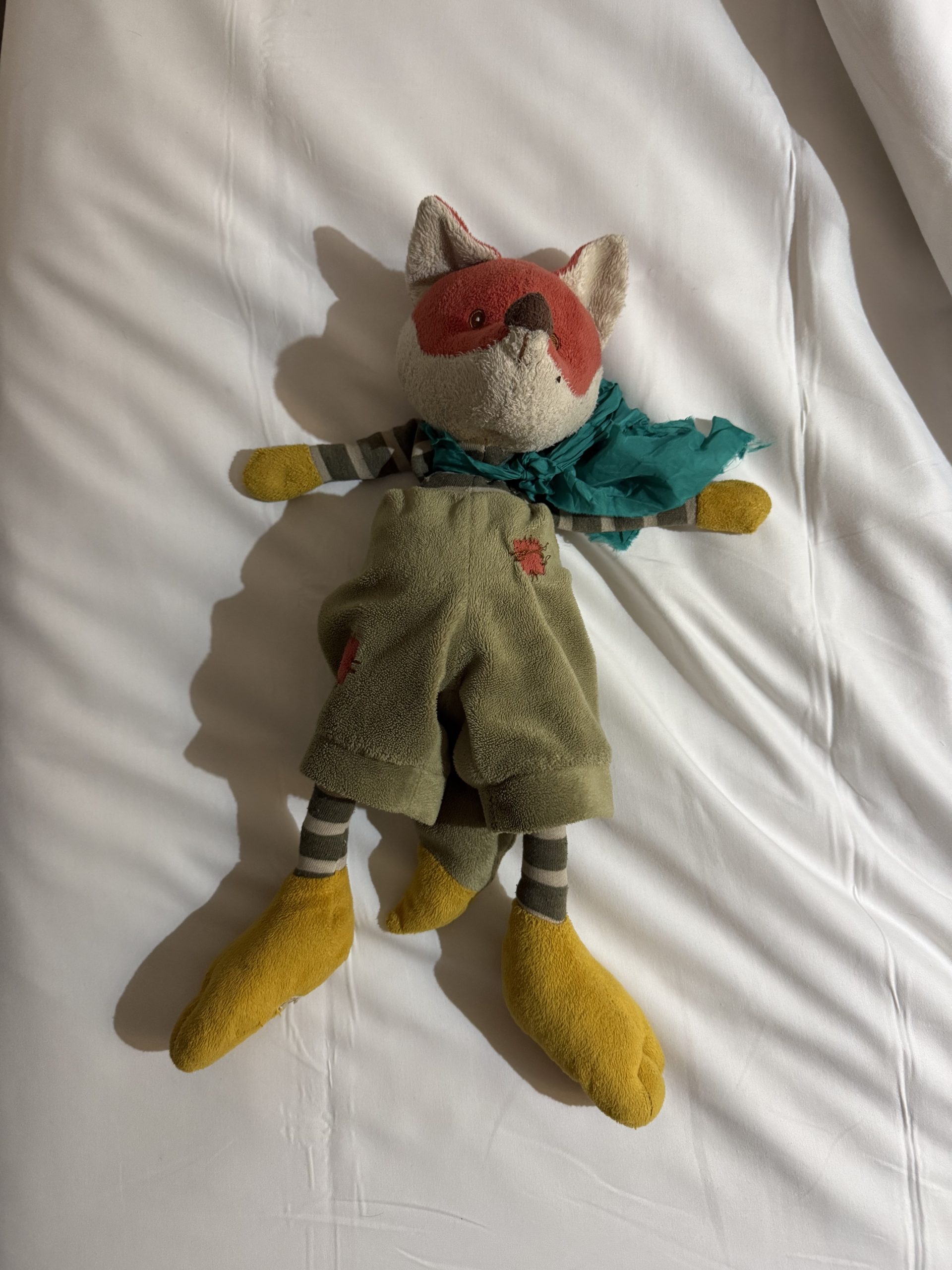 Objet trouvé : Un Doudou renard, tête, rouge/rouille habits, vert, chaussures, jaunes, un foulard vert autour du cou.