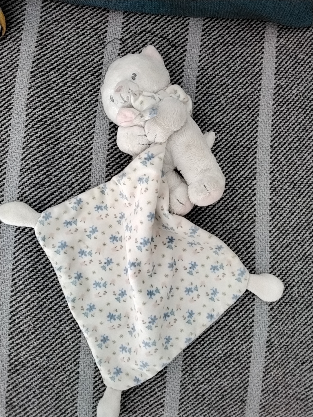 Objet trouvé : Petit ours blanc (environ 15cm) oreilles roses et petit nœud papillon et un doudou attaché avec des papillons, coccinelles….