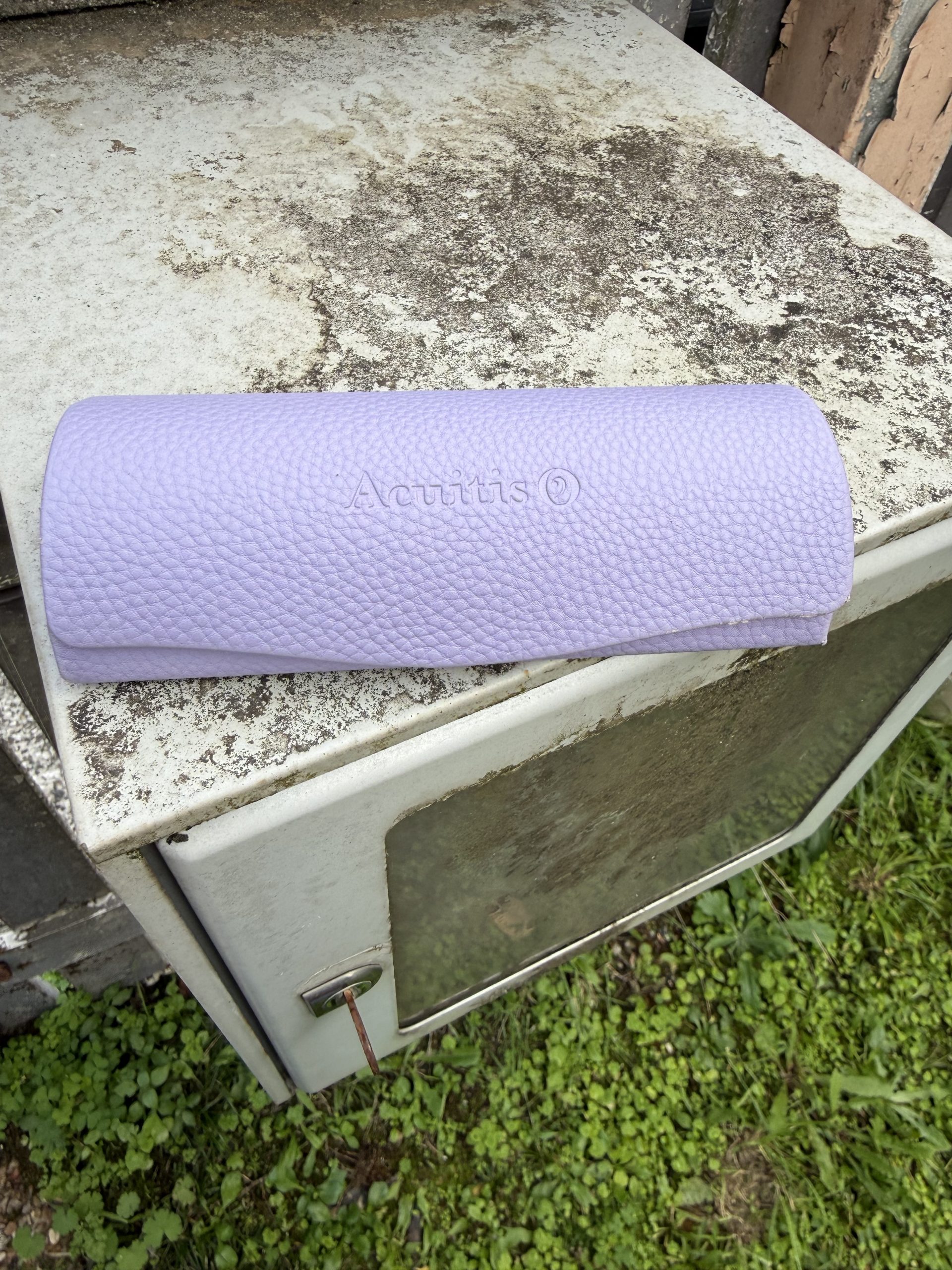 Objet trouvé : Un boîtier de lunettes, couleur lavande de la marque aquitis, avec une paire de solaire à la vue, monture de couleur écaille de tortue.
