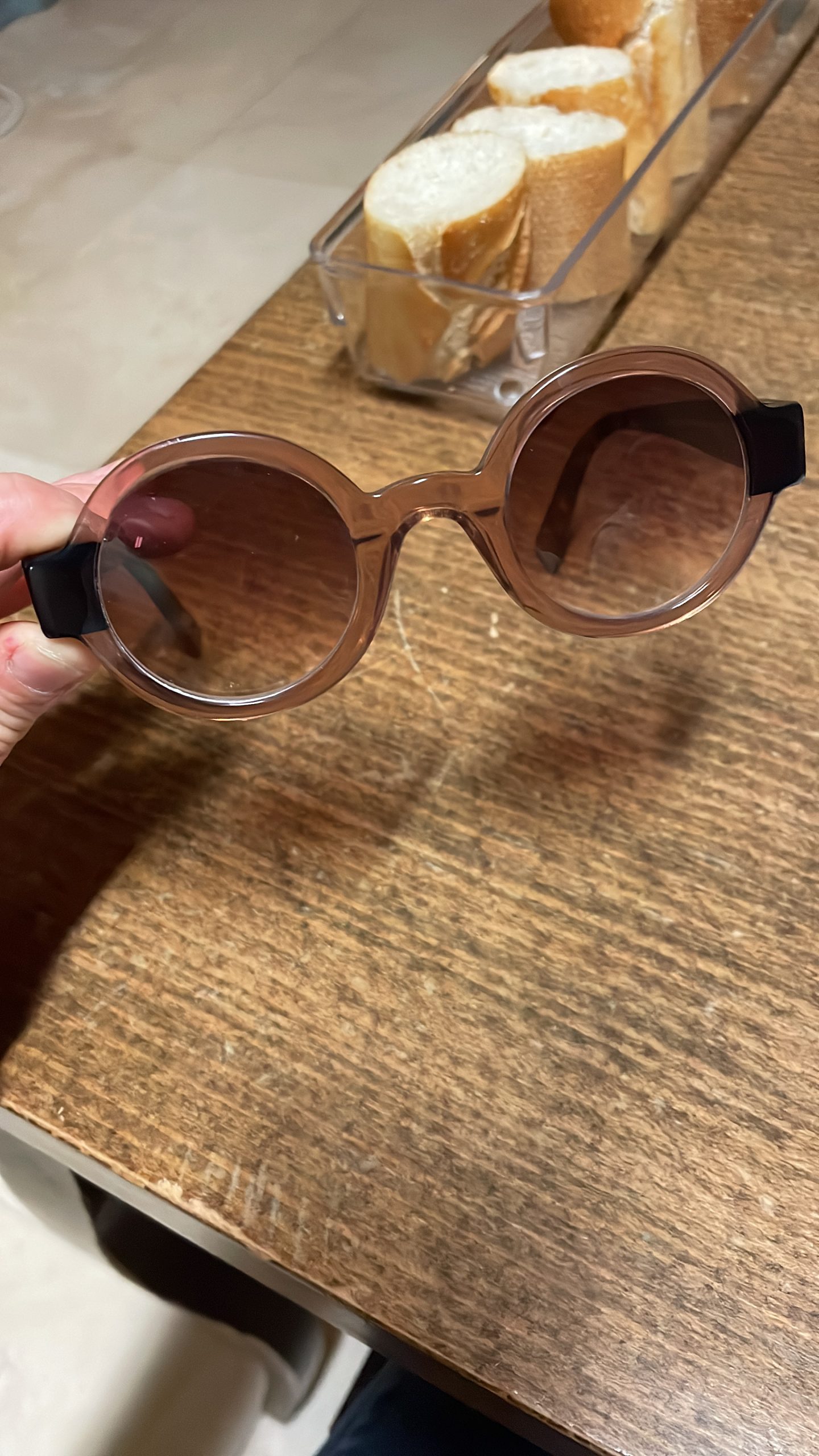 Objet trouvé : Lunettes de soleil avec correction. Modèle de forme ronde en plastique rigide. Rose avec branche « léopard ».
