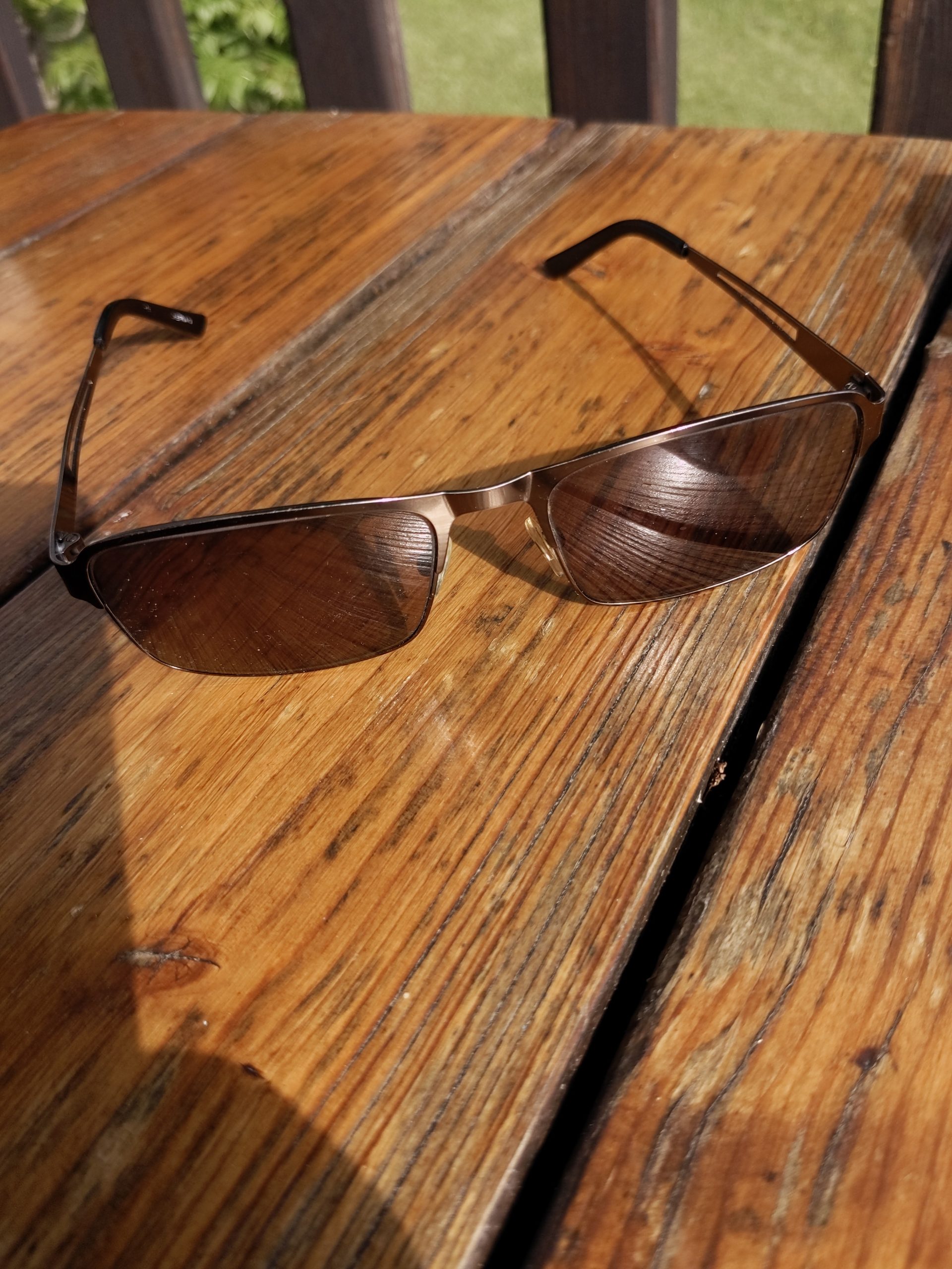 Paire de lunettes de vue verres fumés, monture métallique branches noires, trouvées sur chemin de randonnée.