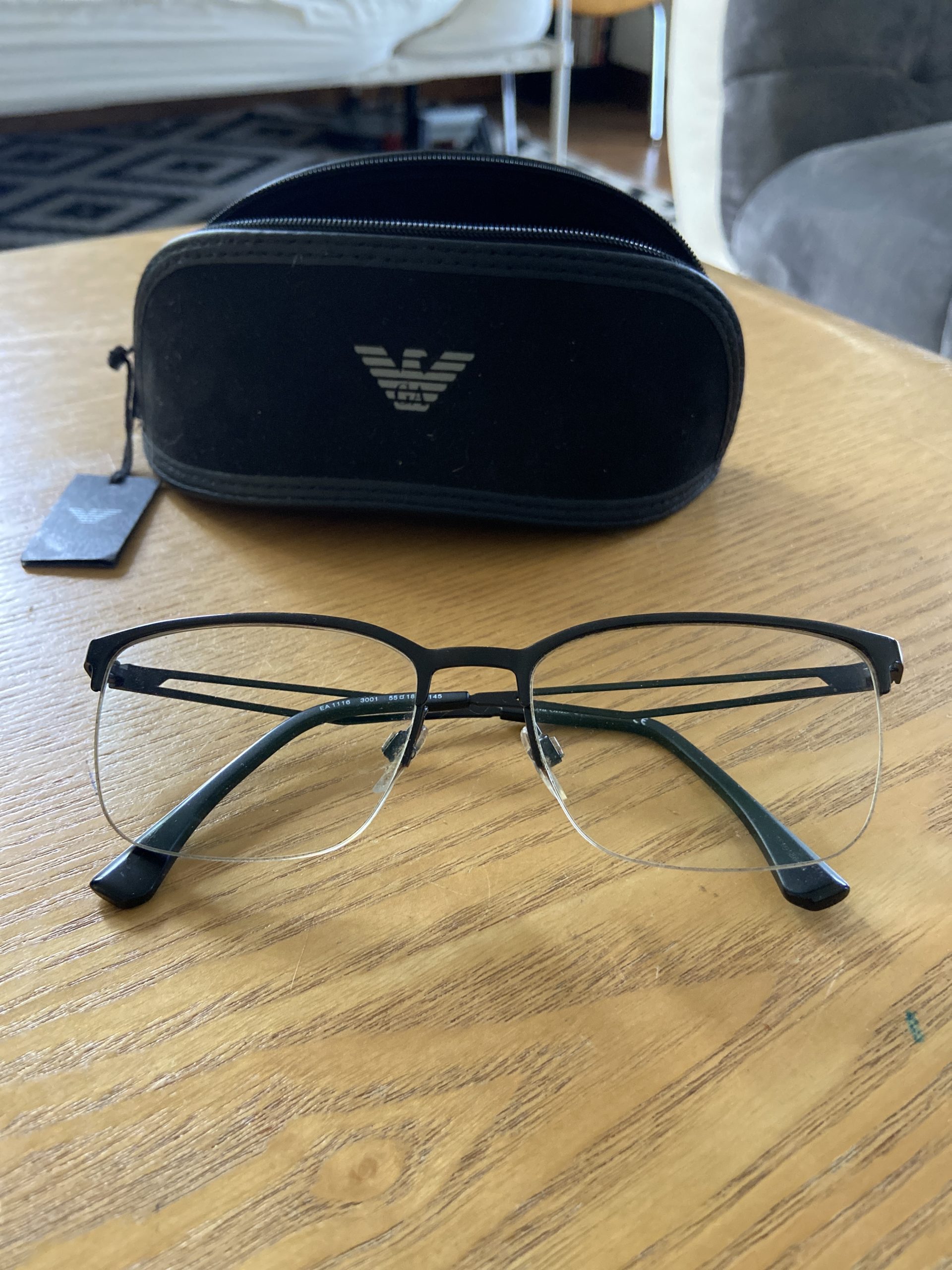 Étui noir Emporio Armani semi rigide avec logo sur le devant qui se ferme avec une fermeture éclair. Lunettes pour hommes noires, montures métal que sur la moitié supérieure des verres.