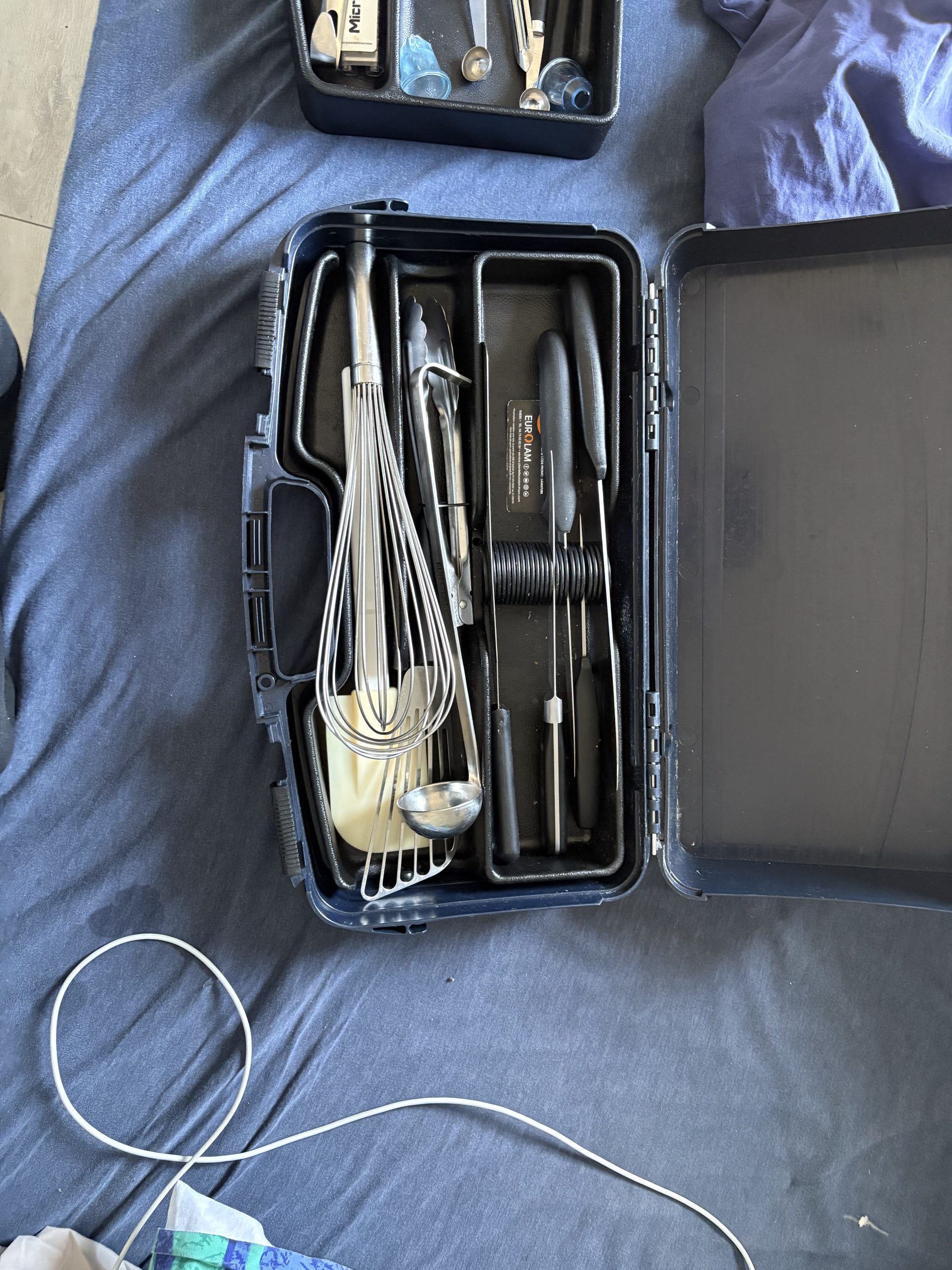 Objet perdu : Malette de cuisine bleue foncée (fouet, marise, pochons, couteaux, spatules, pince, balance, écumoir, corne, …).