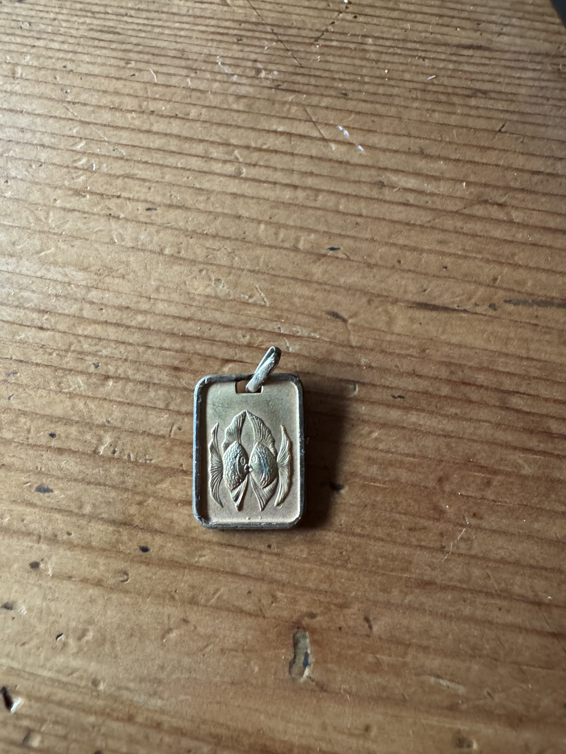Objet trouvé : Il s’agit d’un médaillon rectangulaire, apparence, or qui fait apparaître deux poissons qui se font face à face