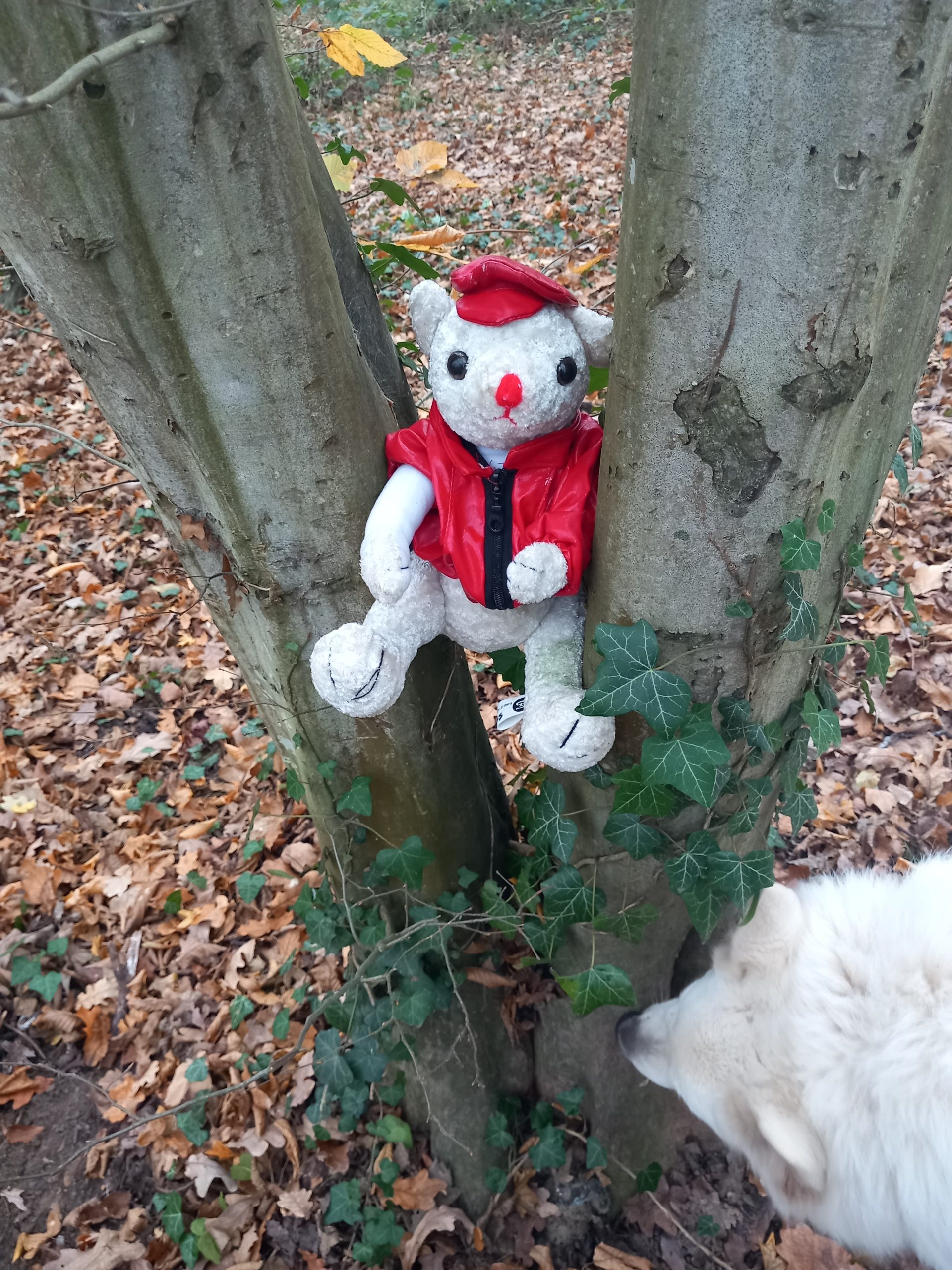 Objet trouvé : Peluche blanche habillée avec blouson et casquette rouge.